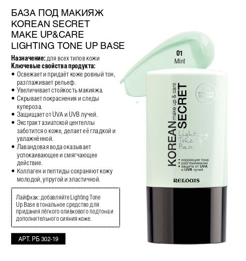 RELOUIS База под макияж KOREAN SECRET make up & care Lighting Tone Up Base 20 г интересное: