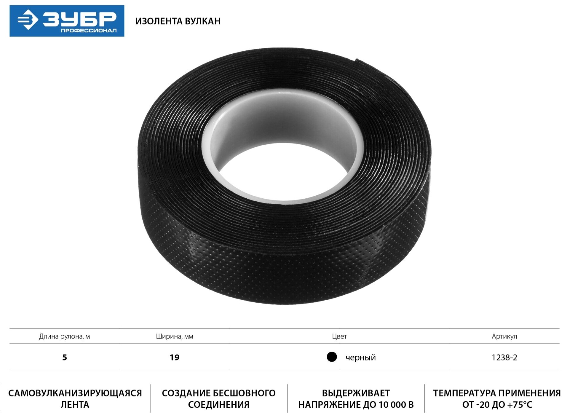 Купить Изоляционная лента ЗУБР Профессионал Вулкан 19 мм х 5 м черная самовулканизирующаяся 1238-2