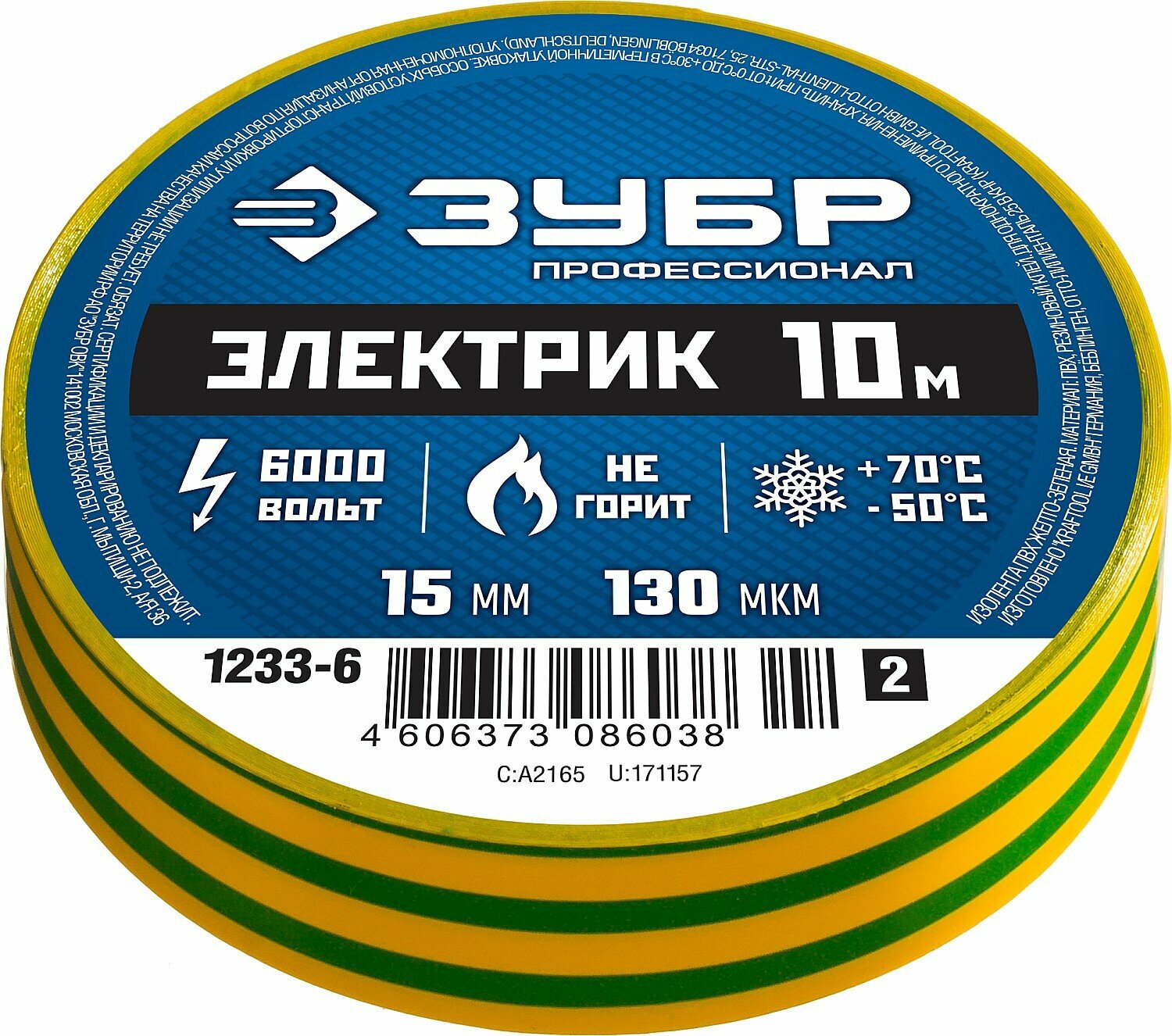 ЗУБР ЭЛЕКТРИК-10, 15 мм х 10 м, 6 000 В, желто-зеленая, не поддерживает горение, изолента ПВХ, Профессионал (1233-6)
