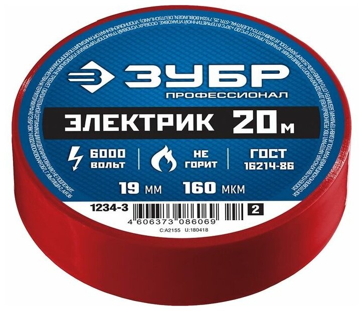 ЗУБР ЭЛЕКТРИК-20, 19 мм х 20 м, 6 000 В, красная, не поддерживает горение, изолента ПВХ, Профессионал (1234-3)