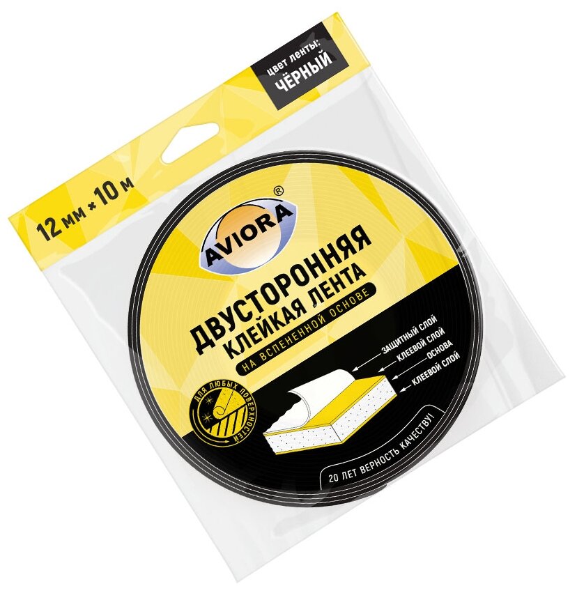 Двусторонняя клейкая лента на вспененной основе 12мм * 10м "AVIORA", чёрная (м302-012)