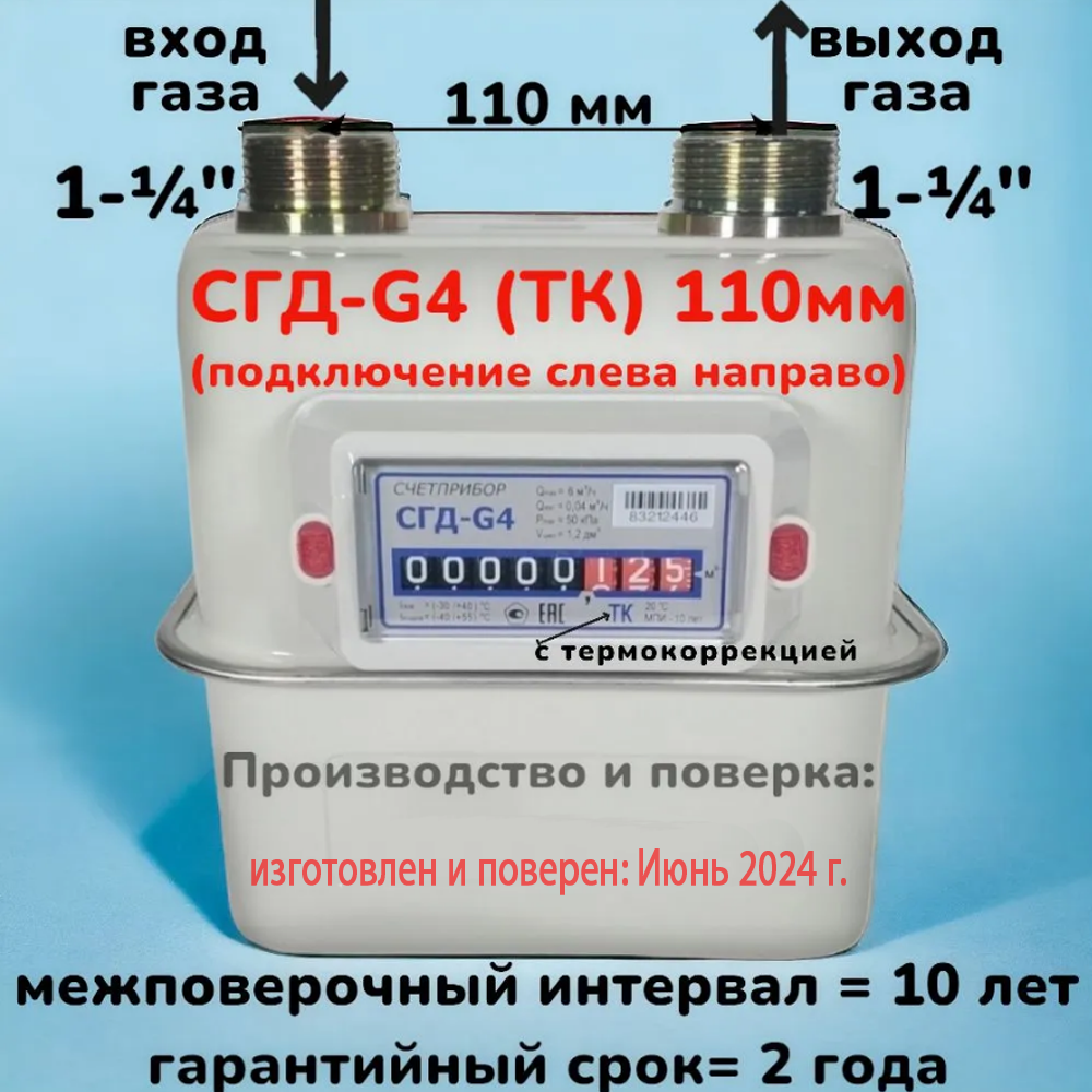 Счетчик газа СГД-G4 ТК с термокоррекцией (вход газа с права, 110мм, резьба 1 1/4" (дюйм с четвертью) )