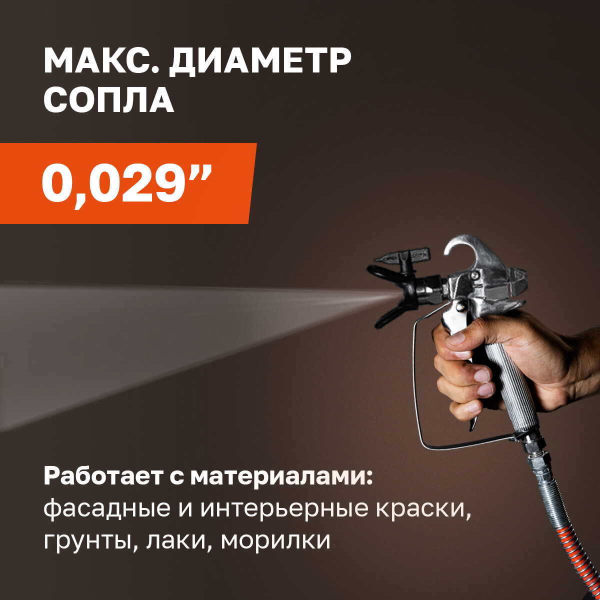 | Подробная комплектация | окрасочный аппарат в комплекте; шланг высокого давления 15 м; пистолет с фильтром в ручке; удлинитель 0,45 м; сопло и соплодержатель; масленка; |