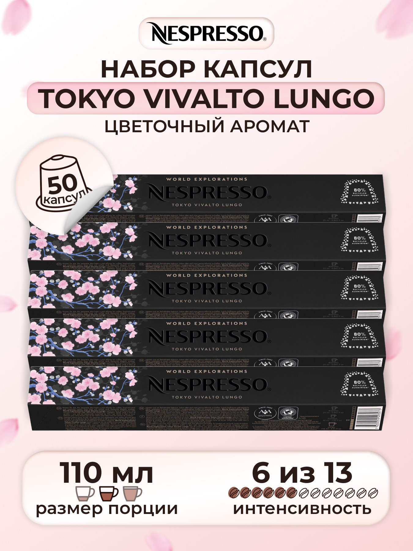 Кофе в капсулах, Nespresso, Tokyo Vivalto Lungo, 110ml, натуральный, молотый кофе в капсулах, для капсульных кофемашин, оригинал, неспрессо , 50шт