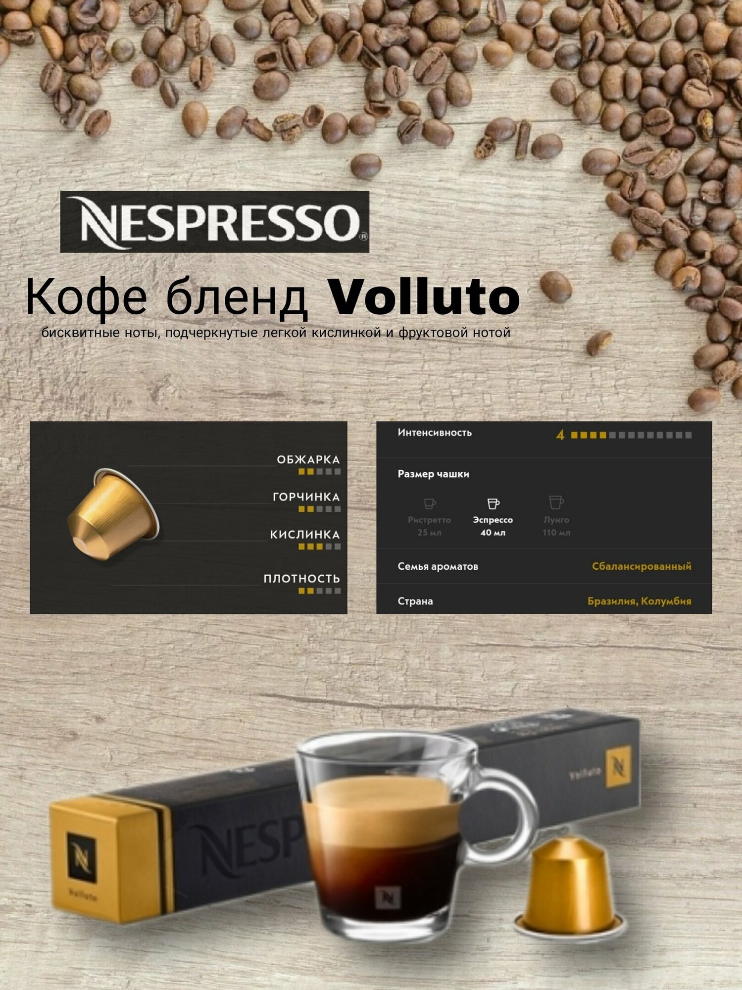 | Дополнительная информация | насыщенный бленд с плотной кремовой текстурой и нотами обжарки; хранить в сухом месте |