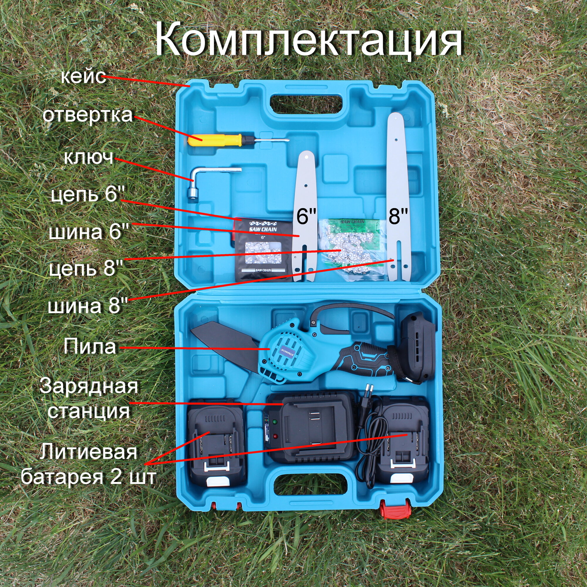 | Комплект поставки | пила, цепь 8", цепь 6", шина 15 см, шина 20 см, АКБ 2 шт, зарядная станция, кейс, отвертка, ключ. |