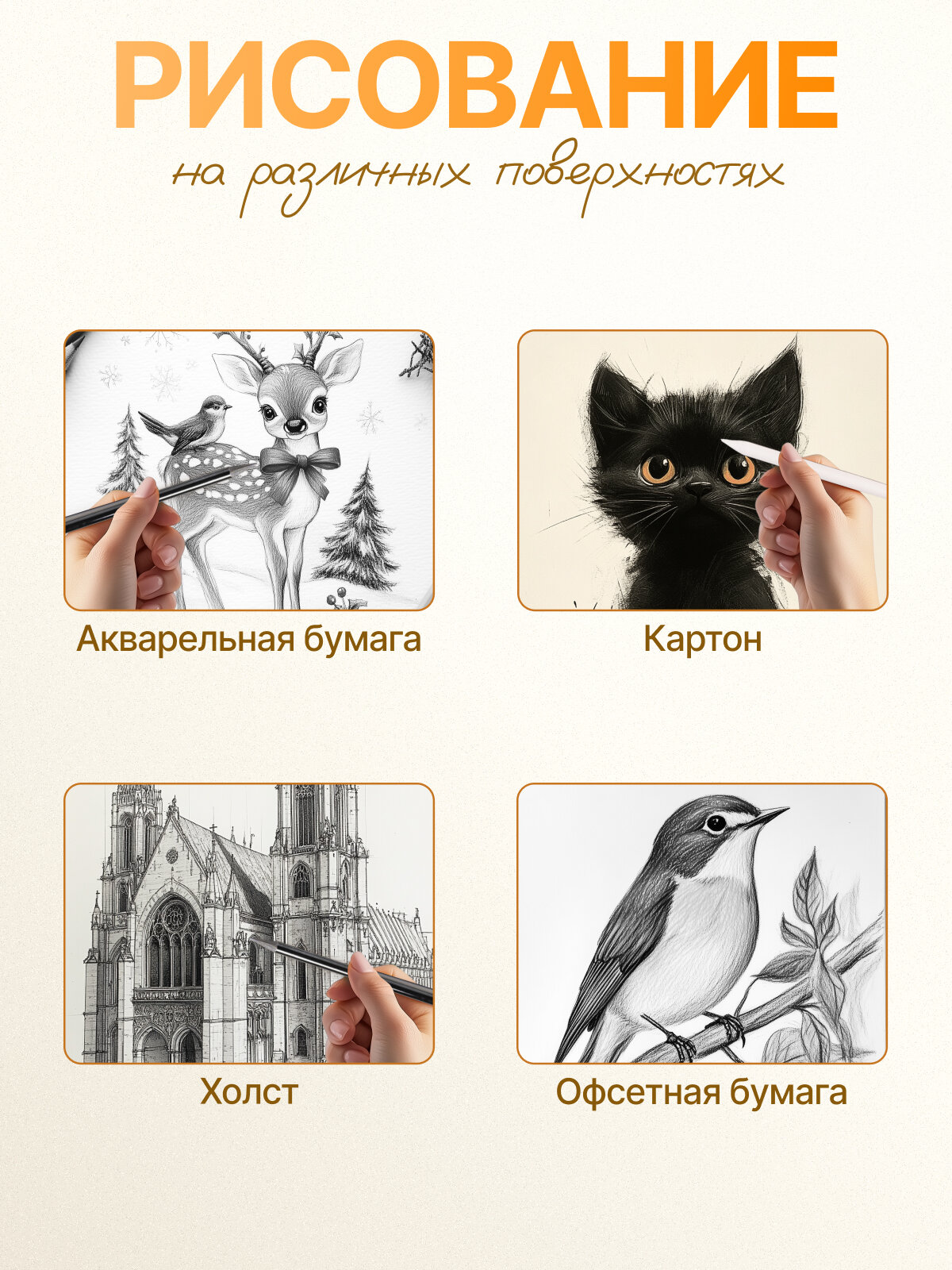 | Состав набора | карандаши / кисточка / ластик / мелки / растушевка / скетчбук / сумка для переноса / точилка / уголь / угольный карандаш |