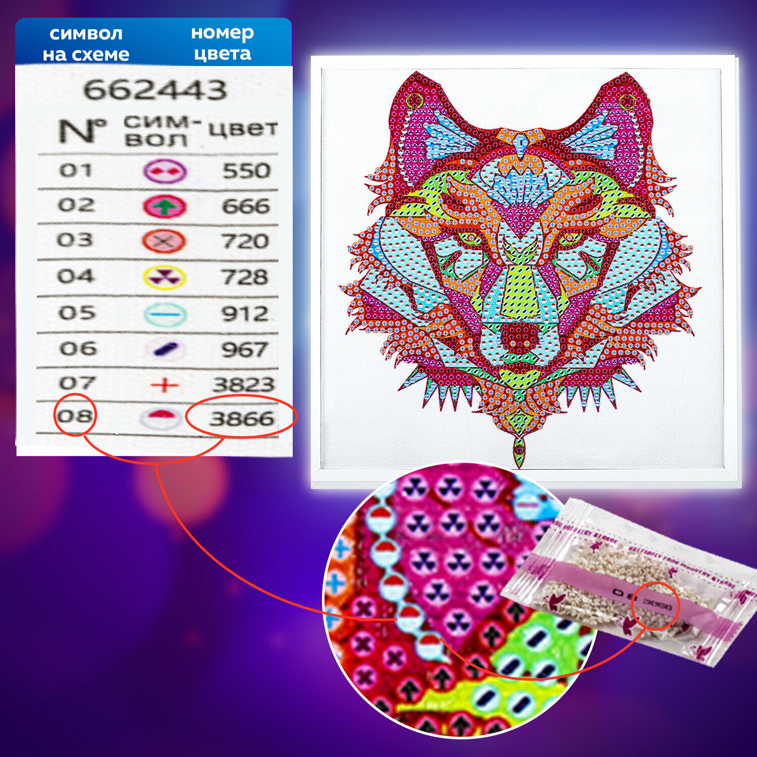 | Особенности | лоток для страз / пинцет / подрамник / с цифрами / стилус / холст / цветная схема / ювелирная огранка |