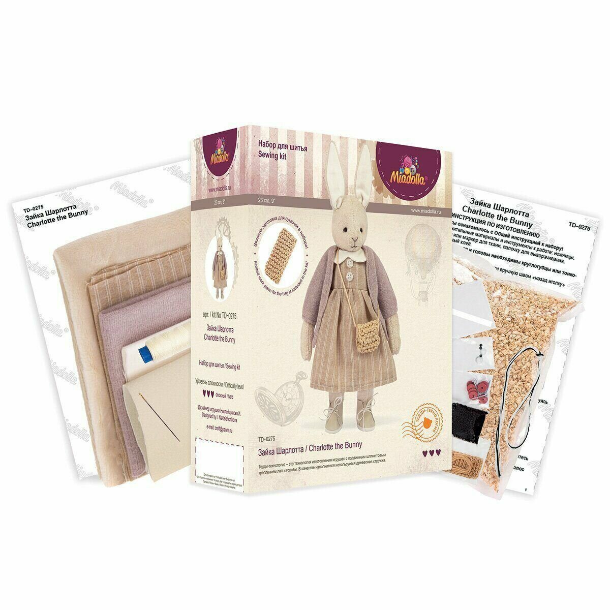 | Комплектация | В набор входят все необходимые материалы: плюш, лен, ткань 100% хлопок, трикотаж, искусственная кожа, вязаная заготовка для сумочки, металлические шплинты и диски из фибры, бусины, пуговицы, пластичная замша, хлопчатобумажные нитки мулине Gamma, швейные нитки, швейная игла, древесная стружка, металлический гранулят, выкройка, подробная инструкция с картинками. |