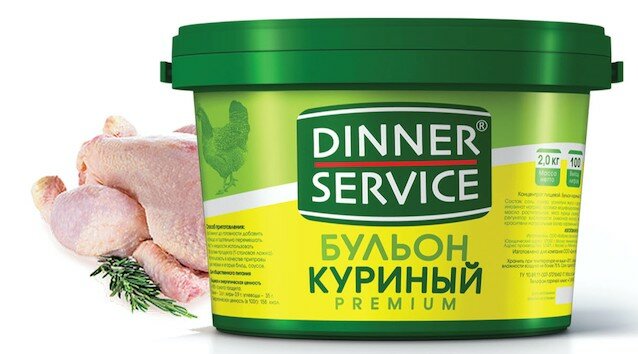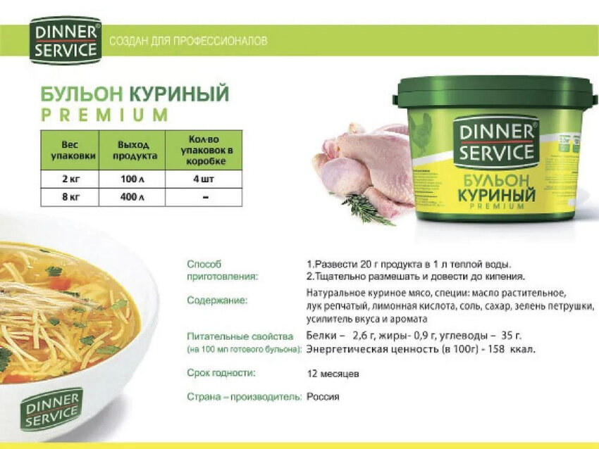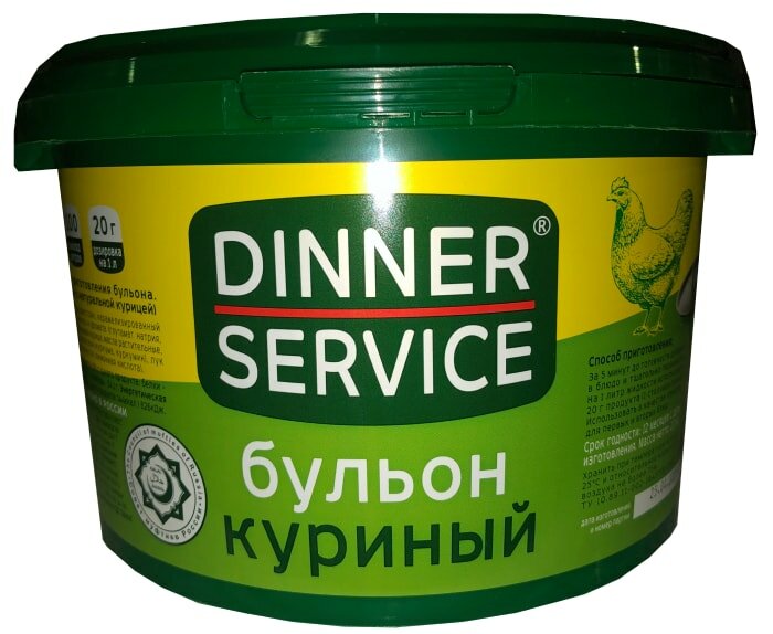 | Дополнительная информация | 20гр (столовая ложка) на литр продукта (из 2 кг сухого бульона DINNER SERVICE можно приготовить 100 л бульона) |