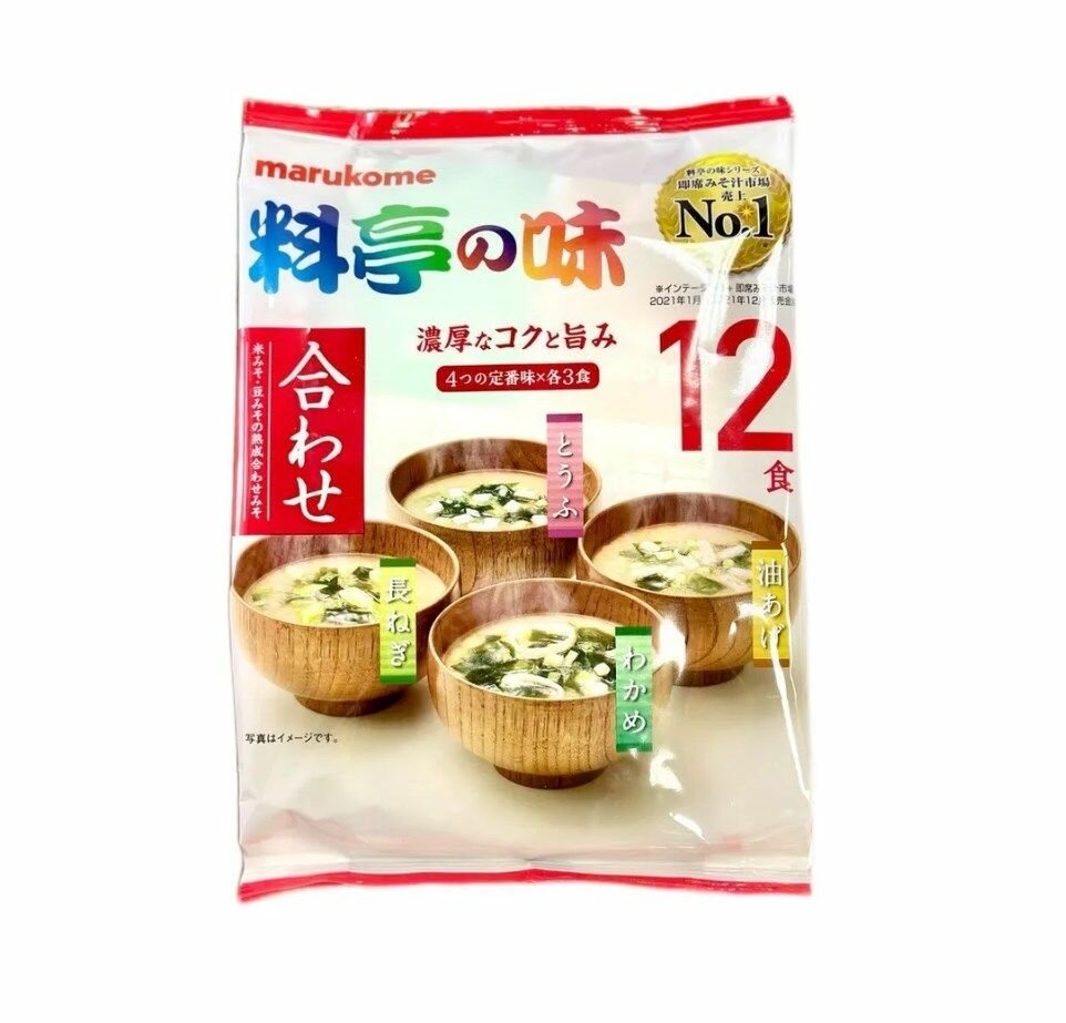 Японский мисо суп Marukome на крабовом бульоне с крабом, с креветками, на бульоне из трех видов рыбы, с водорослями аоса, 4 вида по 128 гр.