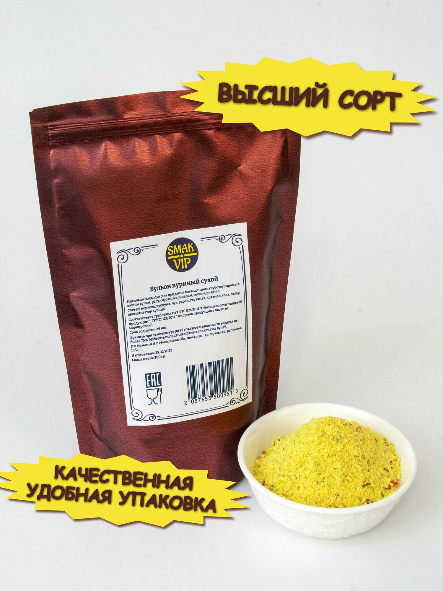 | Состав | морковь куркума лук укроп глутамат натрия крахмал соль сахар ароматизатор курица |