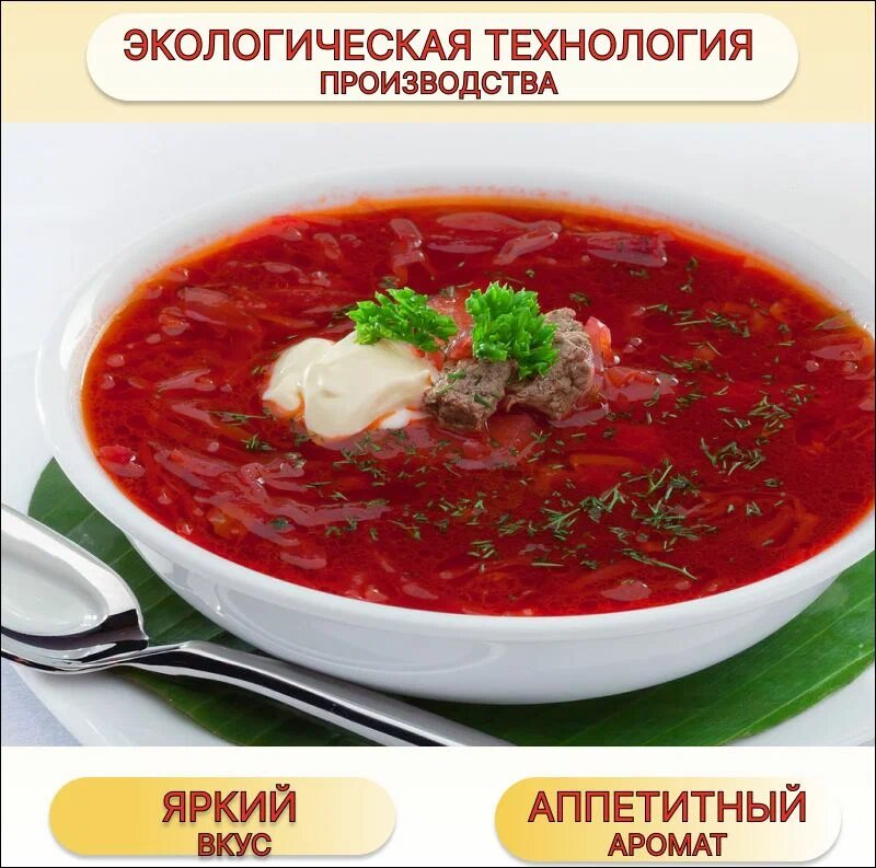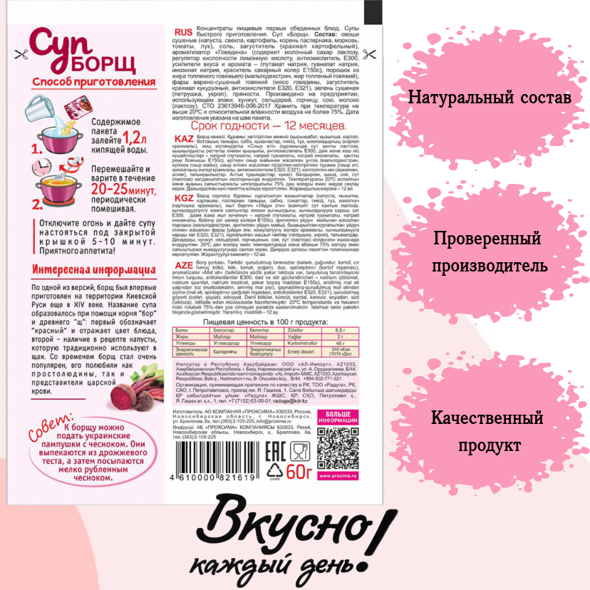 | Состав | овощи сушеные (капуста, свекла, картофель, корень пастернака, морковь, томаты, лук), соль, загуститель (крахмал картофельный, кукурузный), ароматизатор «Говядина», порошок из жира топленого говяжьего, фарш варено-сушеный говяжий, мальтодекстрин, зелень сушеная (петрушка, укроп), регулятор кислотности (лимонная кислота), антиокислители (Е300, Е320, Е321), усилители вкуса и аромата (глутамат натрия, гуанилат натрия, инозинат натрия), краситель (сахарный колер Е150с). |