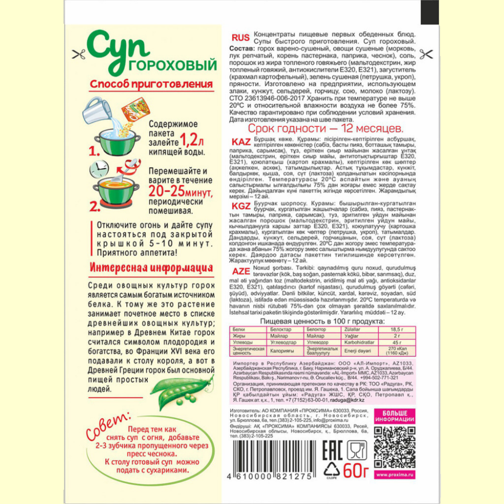 Суп быстрого приготовления гороховый "Приправыч", 60 грамм, 20 штук, 60 порций интересное: