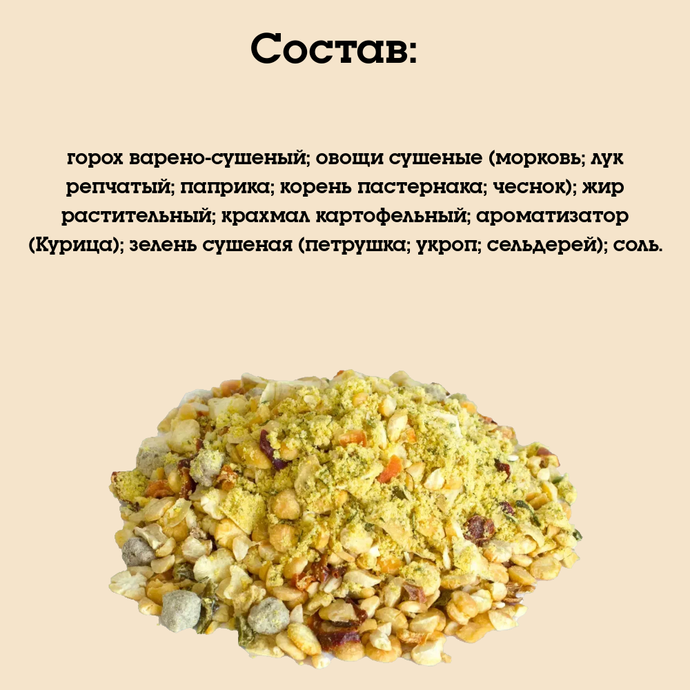 | Состав | горох варено-сушеный, овощи сушеные (морковь, лук репчатый, корень пастернака, паприка, чеснок), соль, порошок из жира топленого говяжьего, загуститель (крахмал картофельный), мальтодекстрин, зелень сушеная (петрушка, укроп), антиокислитель (Е320, Е321) |