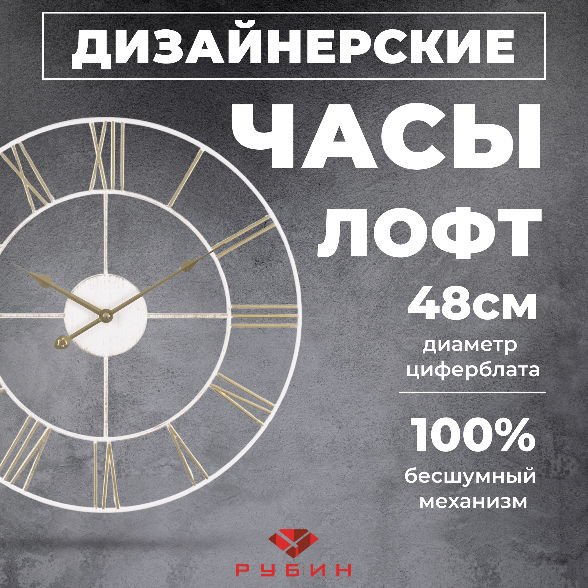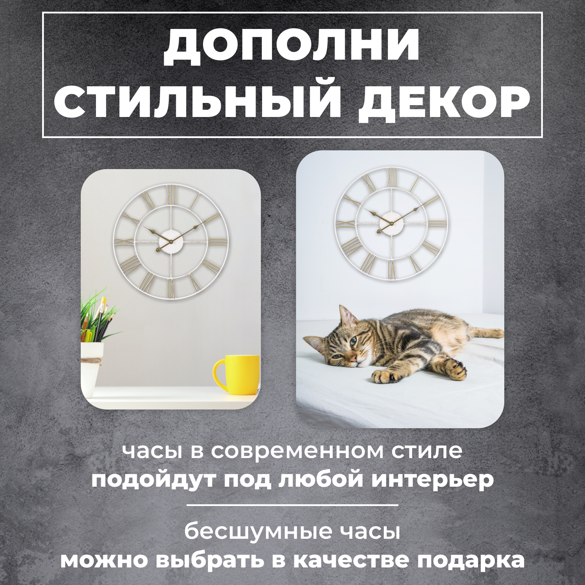 СохранитьБольшие настенные часы Лофт, бесшумные часы d=48 см, часы с римскими цифрами, открытая стрелка, Белый Золото/ Белые большие часы металл интересное: