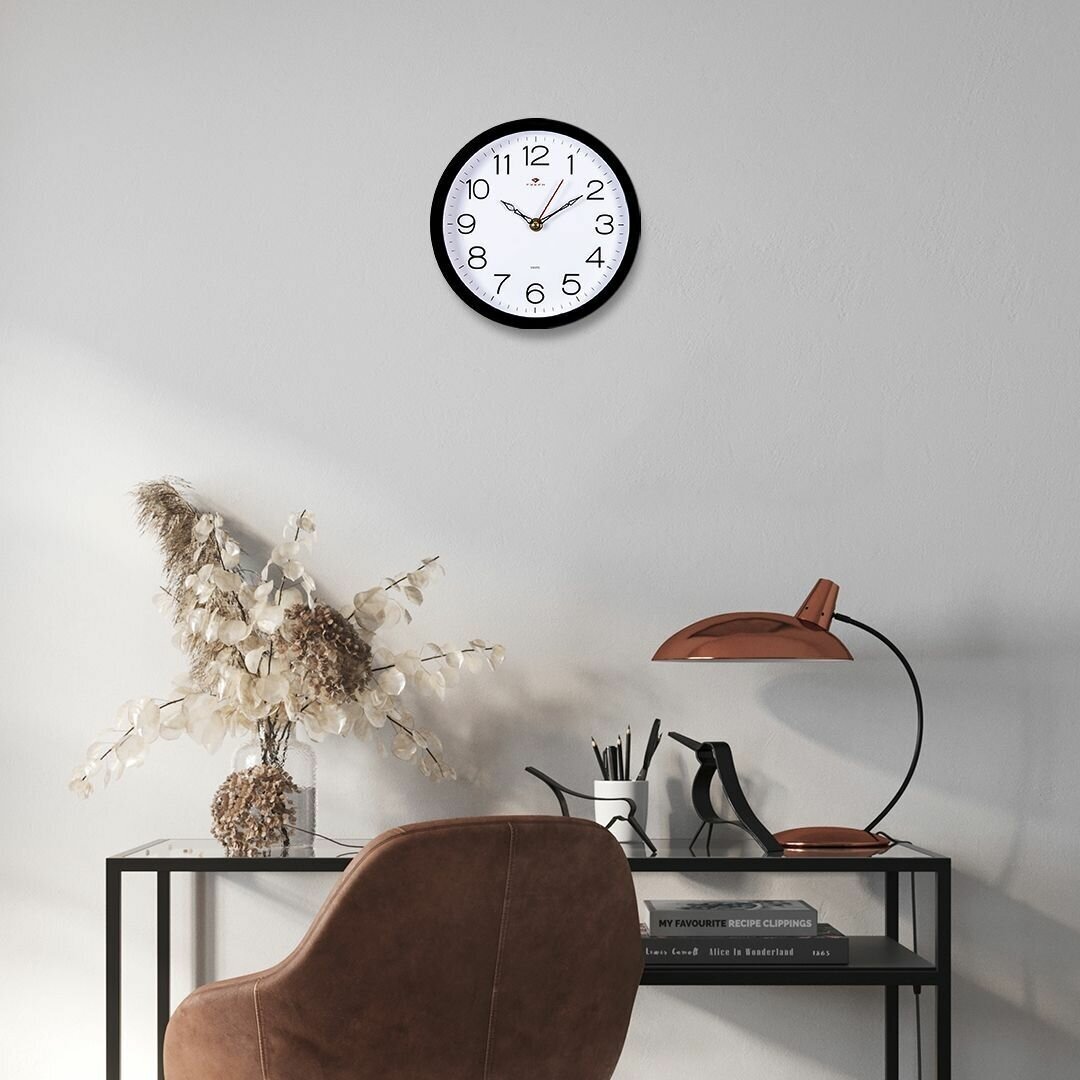 Часы настенные, кварцевые, белые, бесшумные, круглые, пластик, стекло, арабские цифры, Рубин