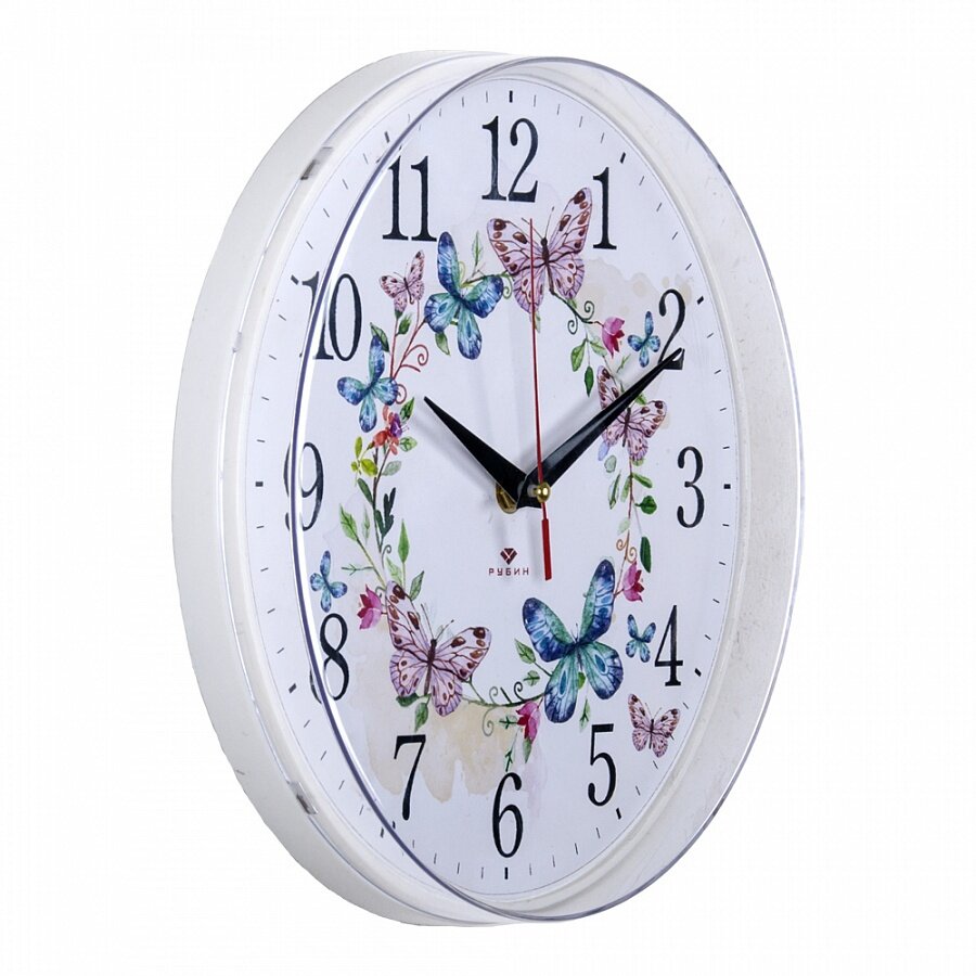 Часы настенные, кварцевые, белые, бесшумные, круглые, пластик, стекло, арабские цифры, Рубин