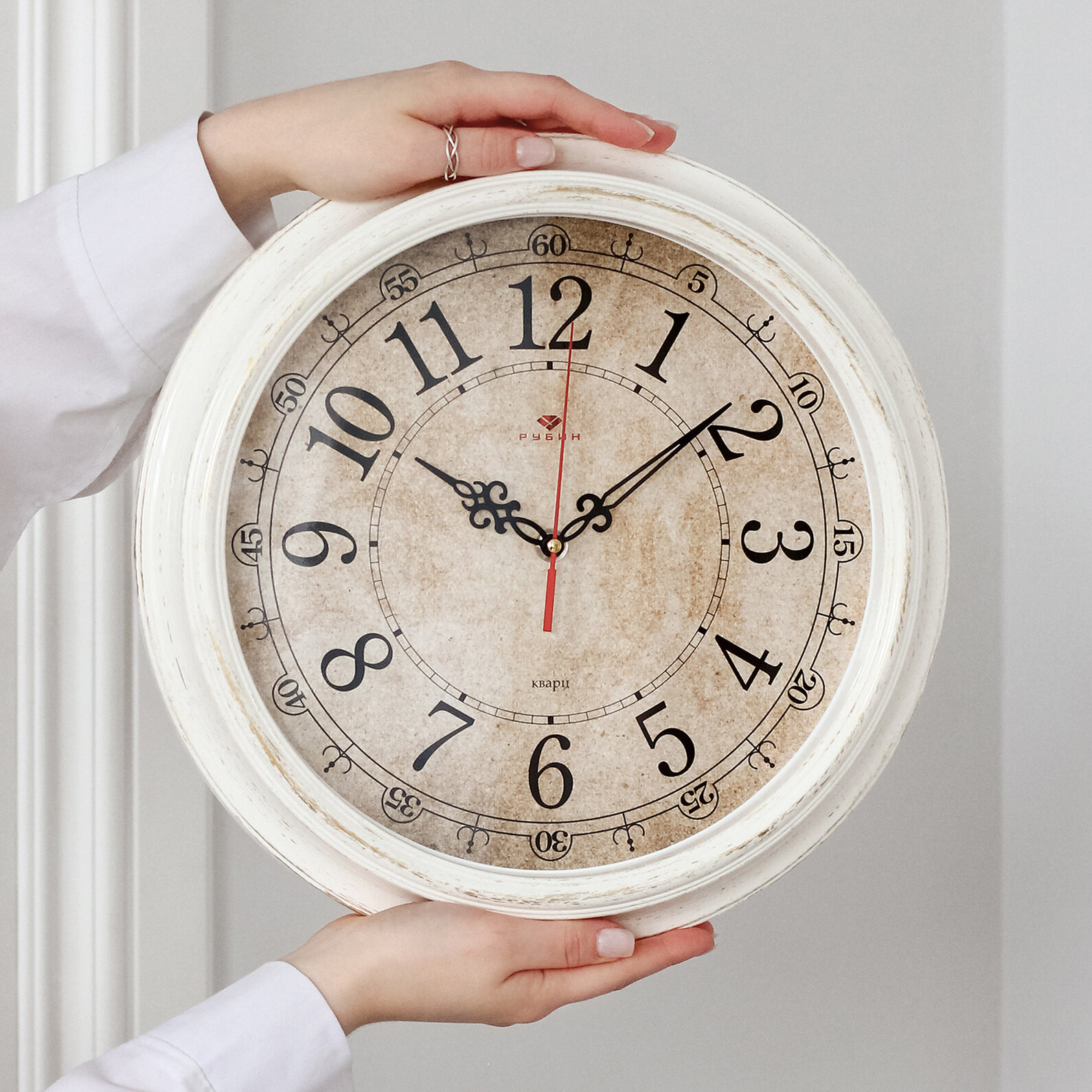 Часы настенные ажурные Рубин, 38см большие кварцевые, белые с плавным ходом