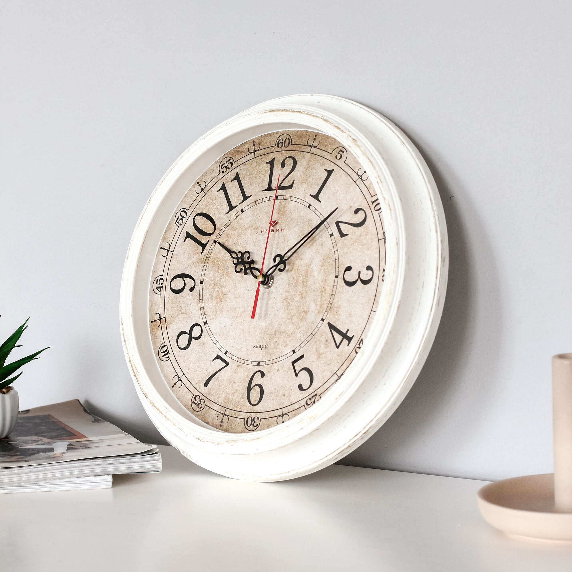 Часы настенные, кварцевые, белые, бесшумные, круглые, пластик, стекло, арабские цифры, Рубин