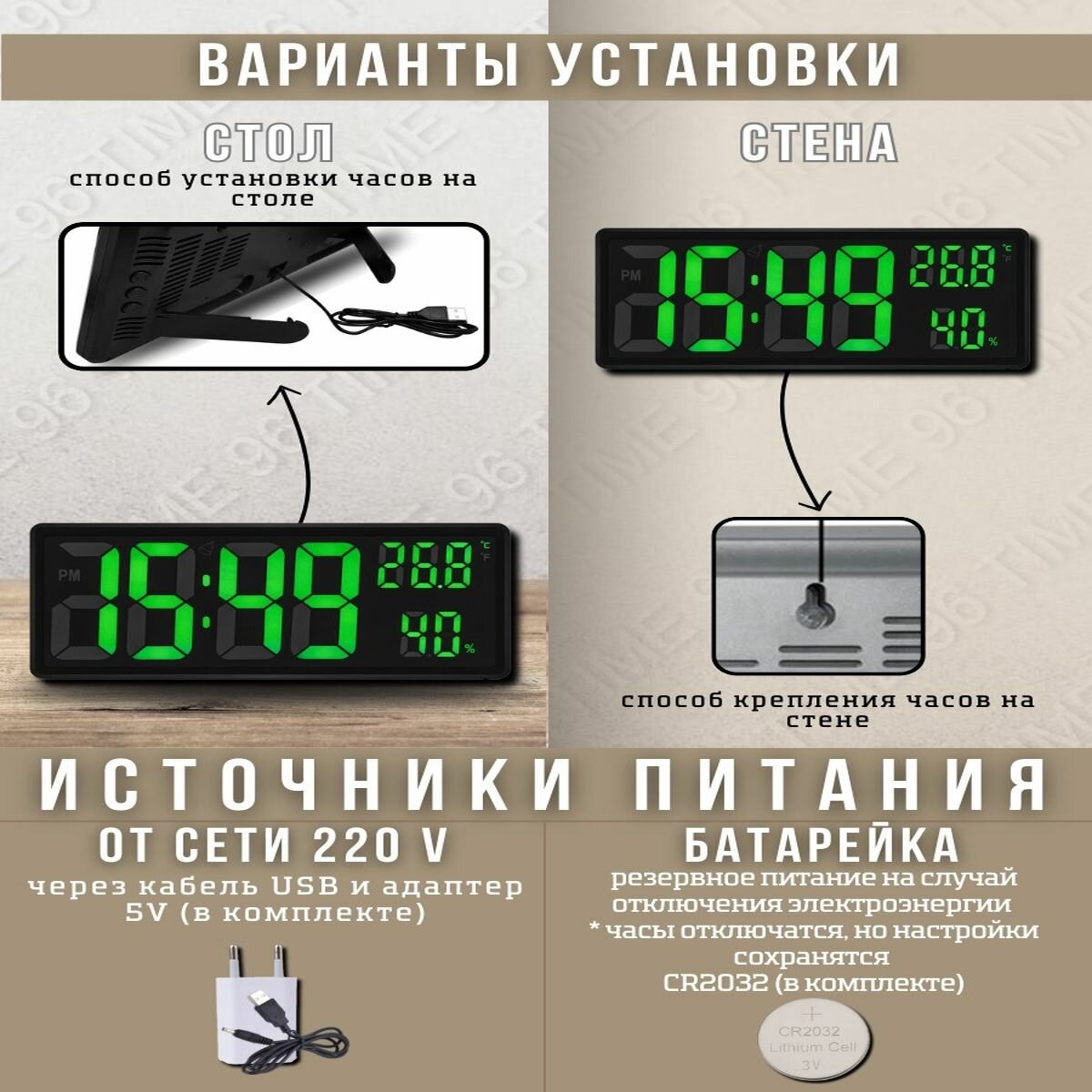 | Комплектация | Часы - 1шт, провод питания - 1шт, блок питания - 1шт, инструкция на русском языке - 1шт |