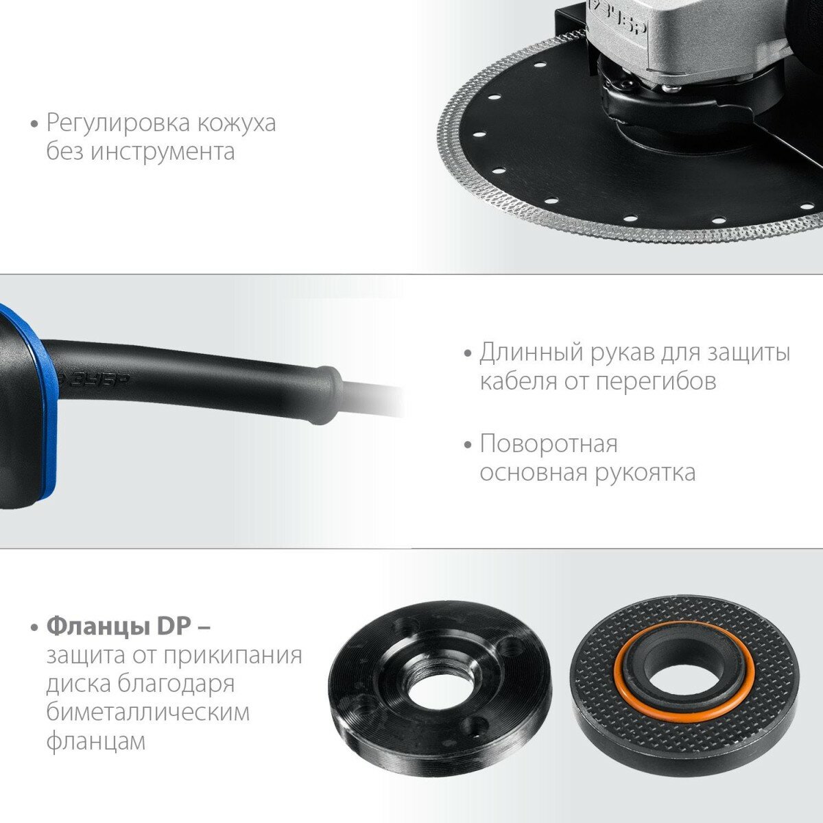 | Особенности конструкции | антивибрационная система / блокировка кнопки включения / двуручная / дополнительная рукоятка / Защитный кожух / регулировка положения кожуха без инструмента / фиксация шпинделя |