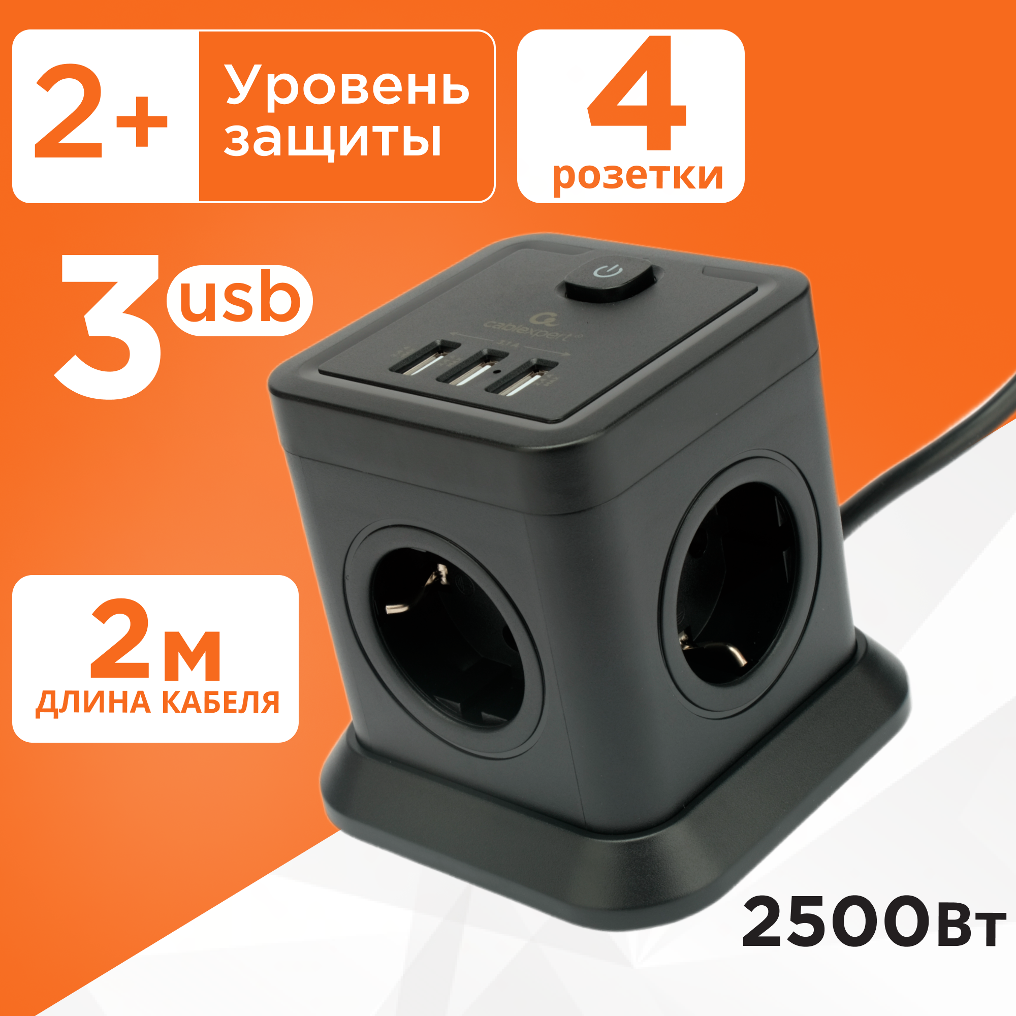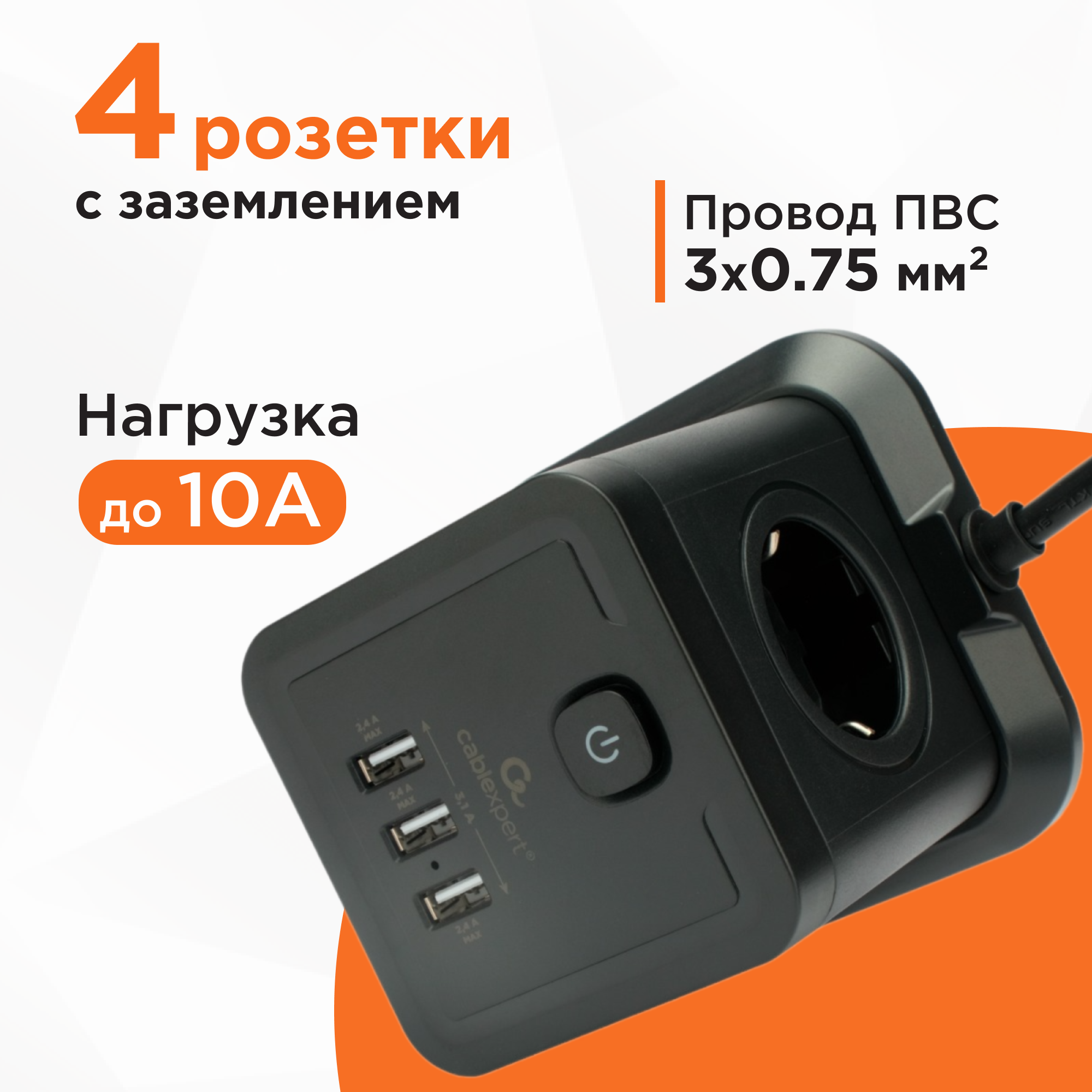 Сетевой фильтр Cablexpert Cube черный 10А 1xType-C 3xUSB 1.5 метра с заземлением выключателем и защитными шторками уровень защиты 4+ CUBE-3-CU3-B-1.5