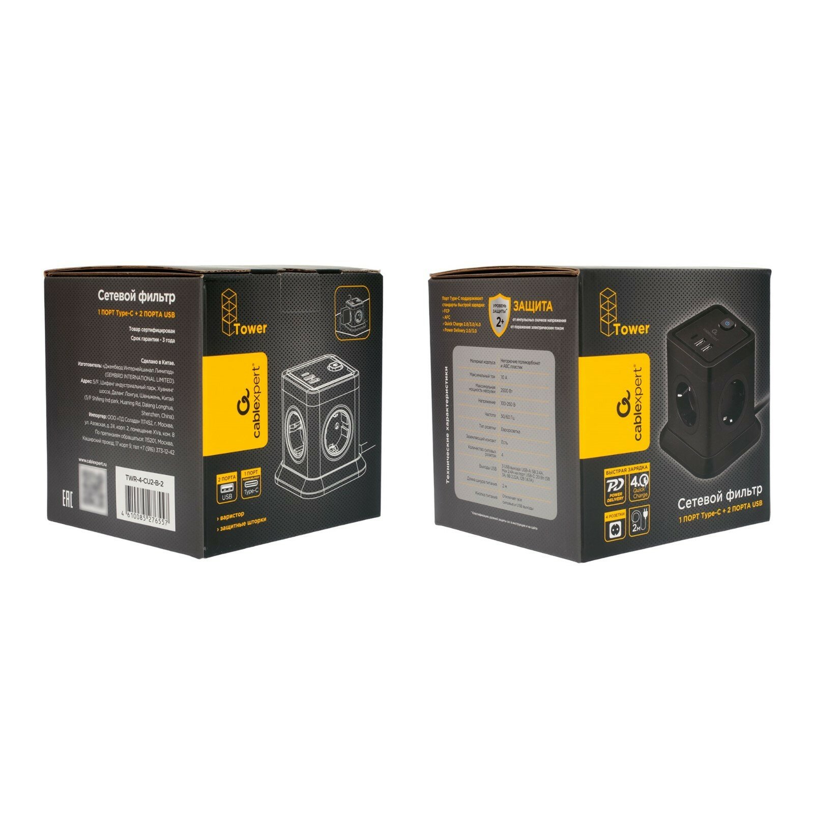 Сетевой фильтр Cablexpert Cube черный 10А 1xType-C 3xUSB 1.5 метра с заземлением выключателем и защитными шторками уровень защиты 4+ CUBE-3-CU3-B-1.5
