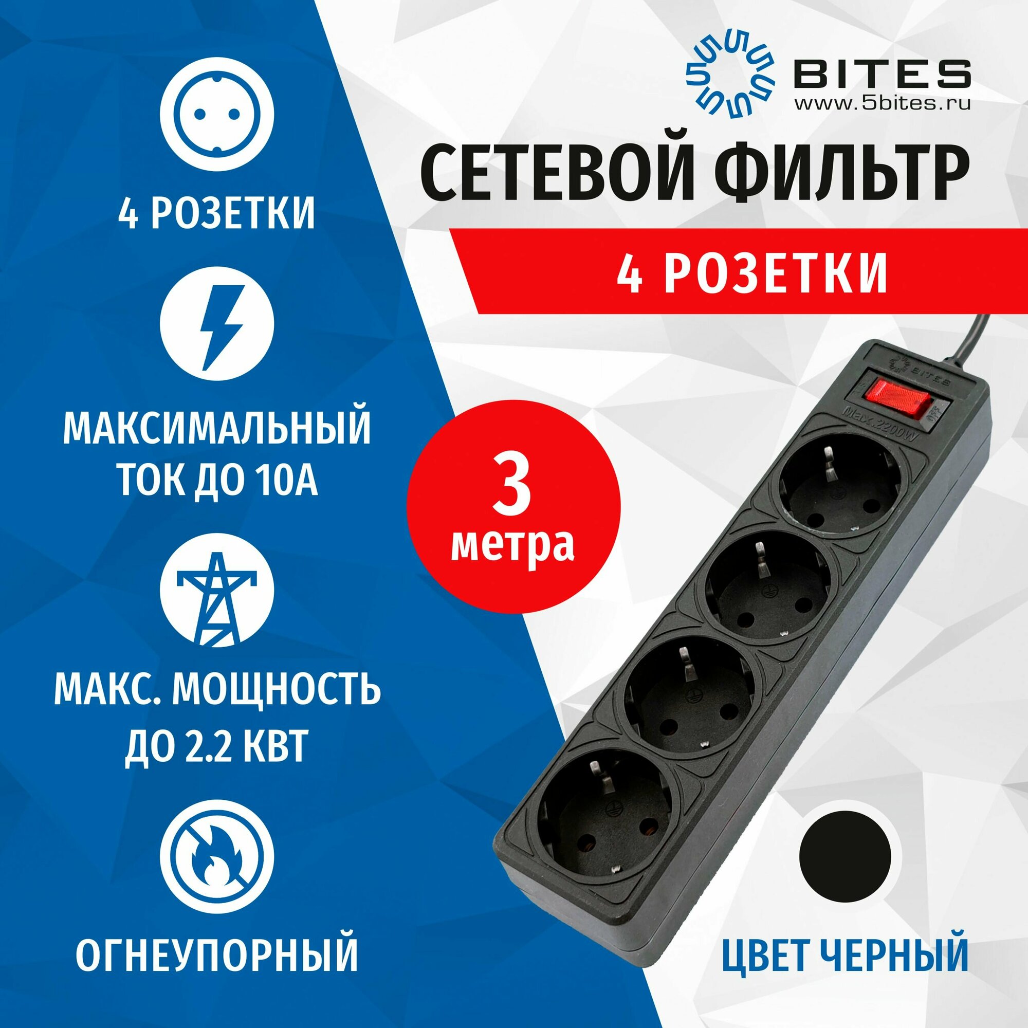Сетевой фильтр 3 метра, 4 розетки, 10А, черный, 5bites GARDA SP4B-530 интересное: