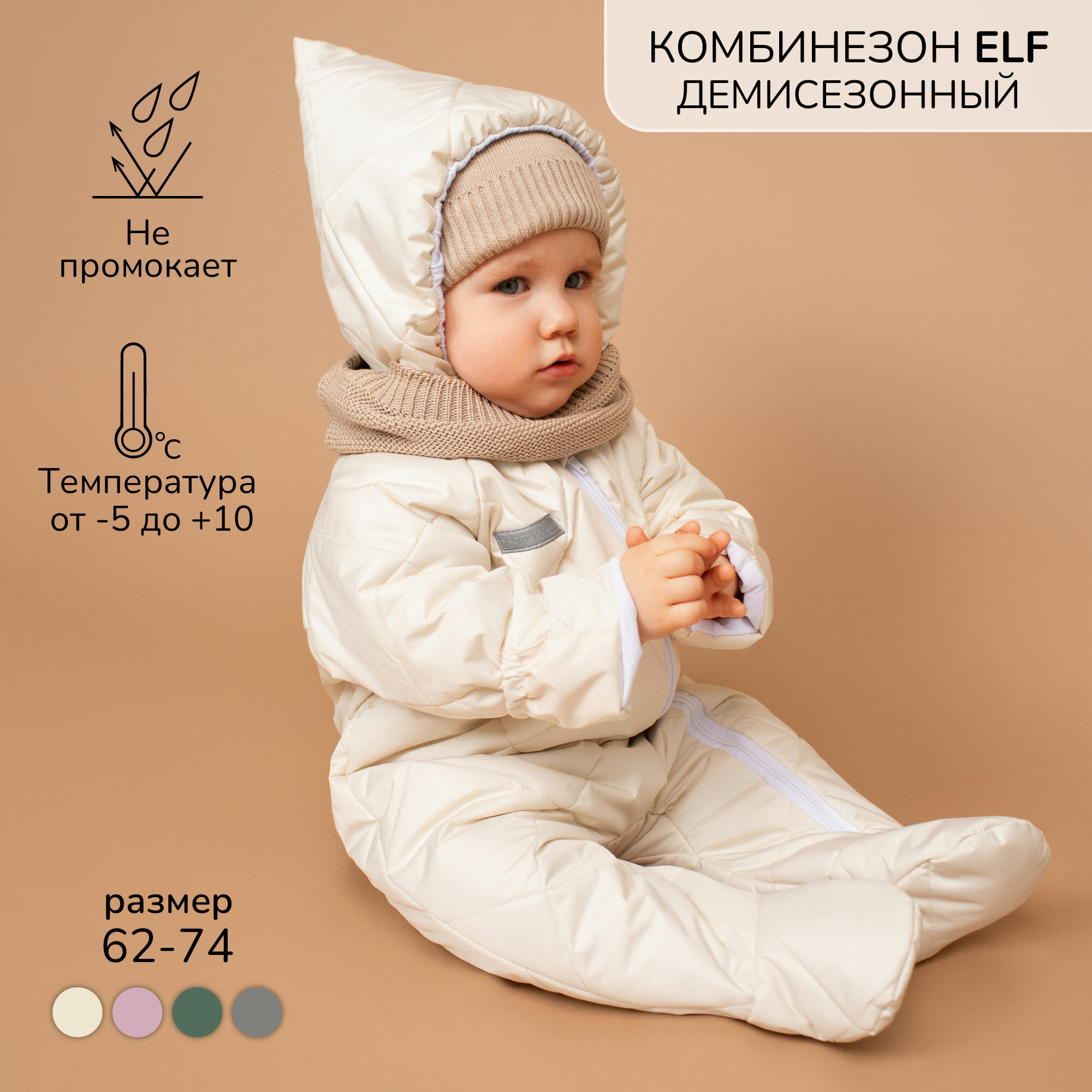 Комбинезон детский демисезонный стеганый с закрытыми ножками Amarobaby ELF, молочный, размер 62