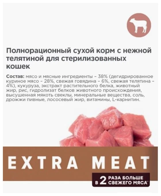 Полнорационный сухой корм Extra Meat с нежной телятиной для стерилизованных кошек старше 1 года 10кг