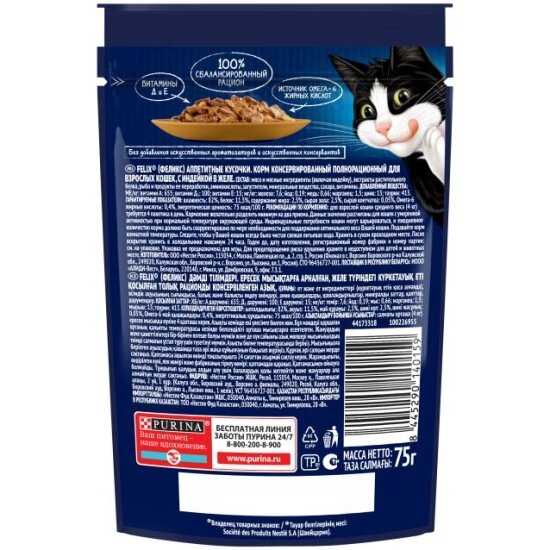 Купить Влажный корм для взрослых кошек Felix Аппетитные кусочки индейка в желе 26шт.*75г