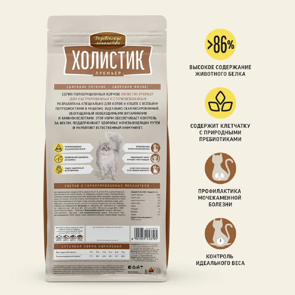 2кг+2кг Сухой полнорационный корм деревенские лакомства холистик премьер для поддержки иммунитета кошек с говядиной