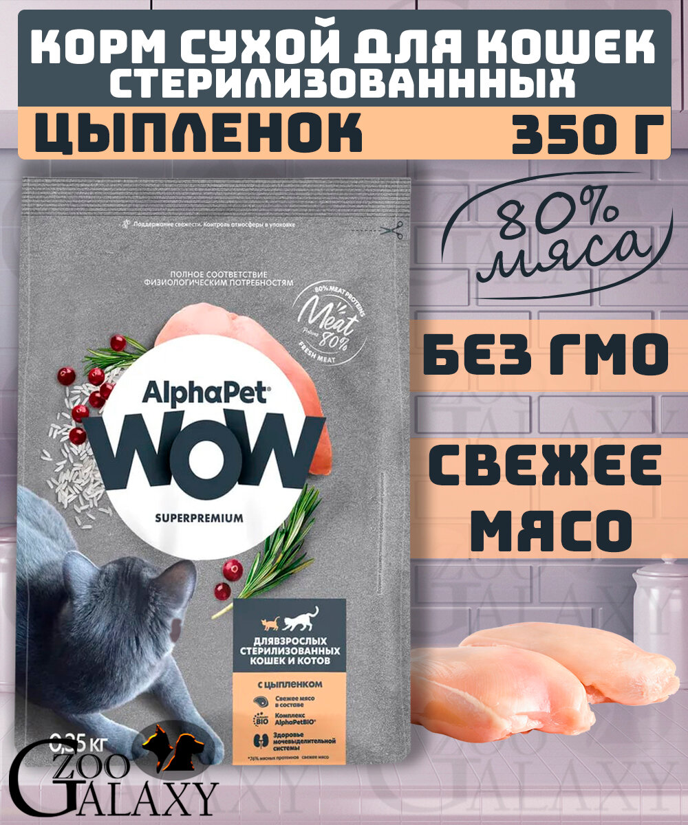 ALPHAPET WOW SUPERPREMIUM сухой корм для взрослых стерилизованных кошек и котов c цыпленком 350 гр