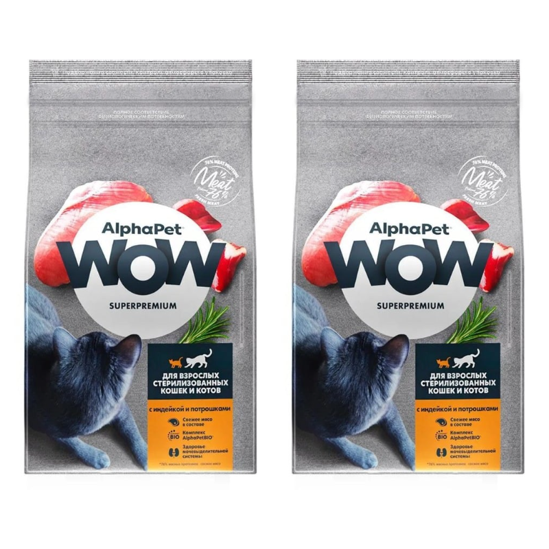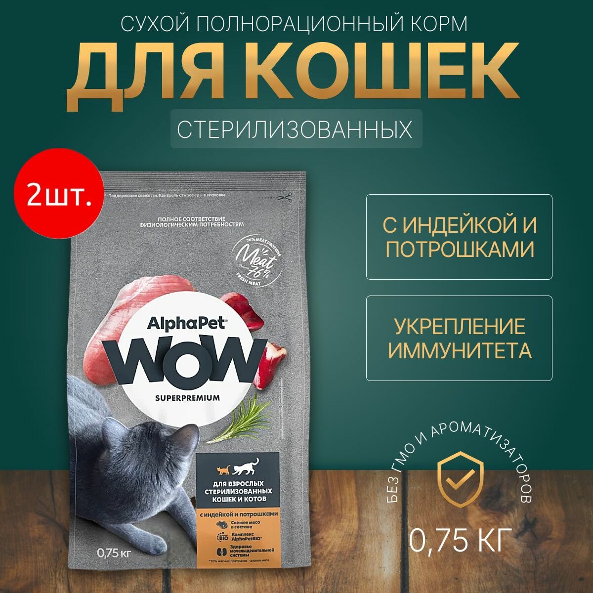 ALPHAPET WOW SUPERPREMIUM 750 гр сухой корм для взрослых стерилизованных кошек и котов с индейкой и , шт (2 шт)