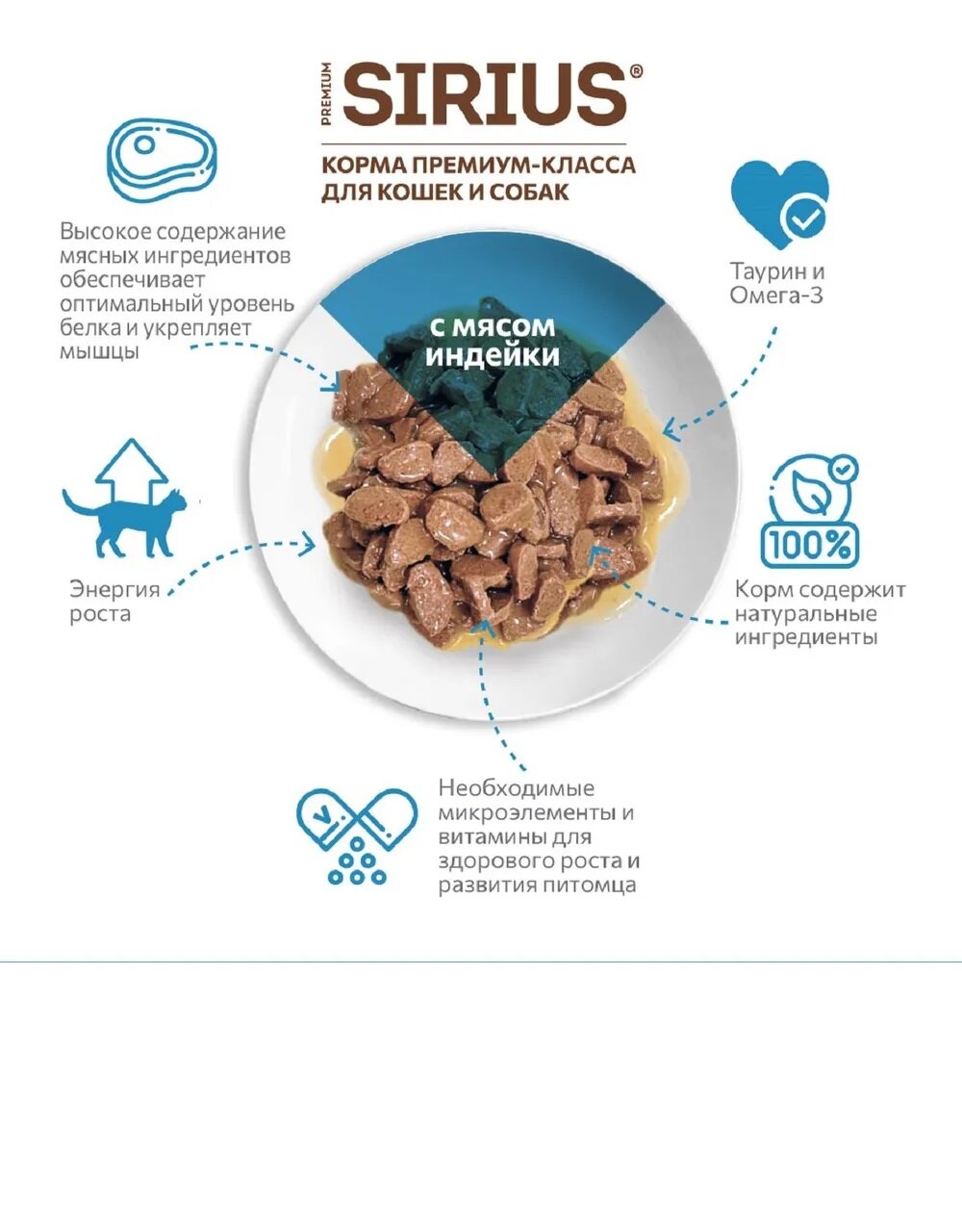 SIRIUS PREMIUM KITTEN 85 г пауч полнорационный консервированный корм для котят с мясом индейки 1х24