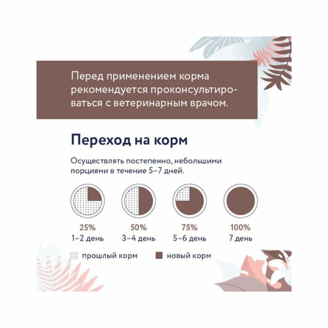 | Дополнительная информация | Переход с предыдущего рациона осуществлять постепенно, небольшими порциями в течение 5-7 дней. При кормлении необходимо учитывать активность и аппетит животного. Корм должен быть комнатной температуры. Содержимое открытой упаковки хранить при температуре +5°С и использовать в течение 2 дней. У кошки всегда должен быть доступ к свежей питьевой воде. |