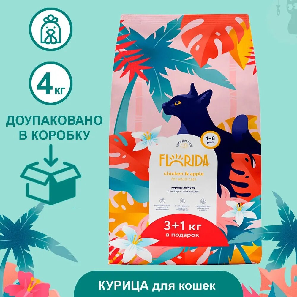 Купить FLORIDA Сухой корм для взрослых кошек, с курицей и яблоком, Adult Chicken, 3+1 кг