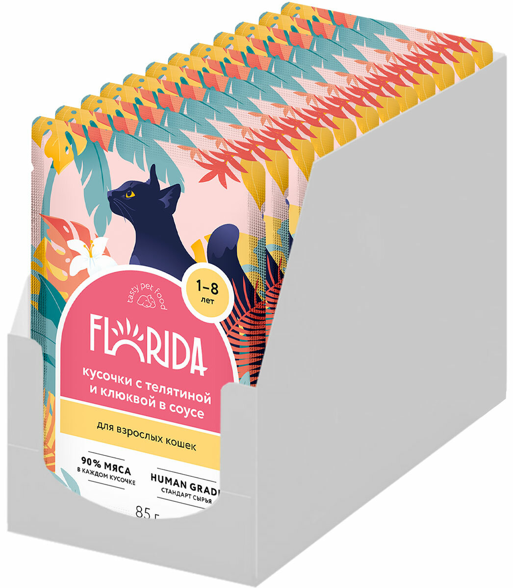 Купить FLORIDA Паучи для взрослых кошек: кусочки с телятиной и клюквой в соусе, 12 шт по 85 г