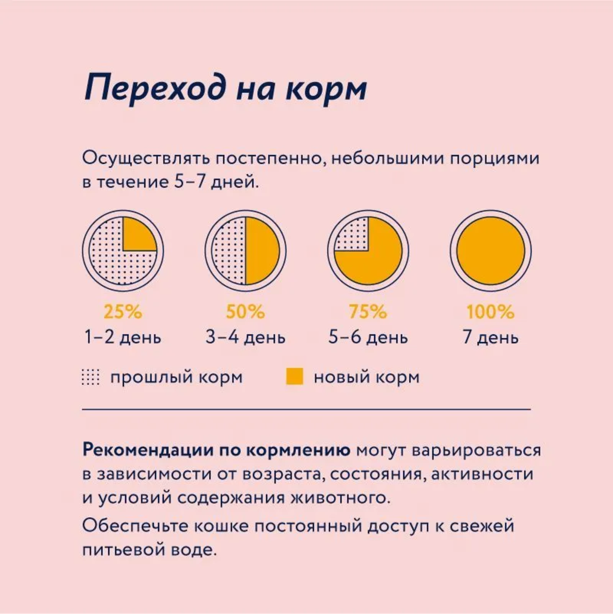 | Дополнительная информация | Переход с предыдущего рациона осуществлять постепенно, небольшими порциями в течение 5-7 дней. При кормлении необходимо учитывать активность и аппетит животного. Корм должен быть комнатной температуры. Содержимое открытой упаковки хранить при температуре +5°С и использовать в течение 2 дней. У кошки всегда должен быть доступ к свежей питьевой воде. |