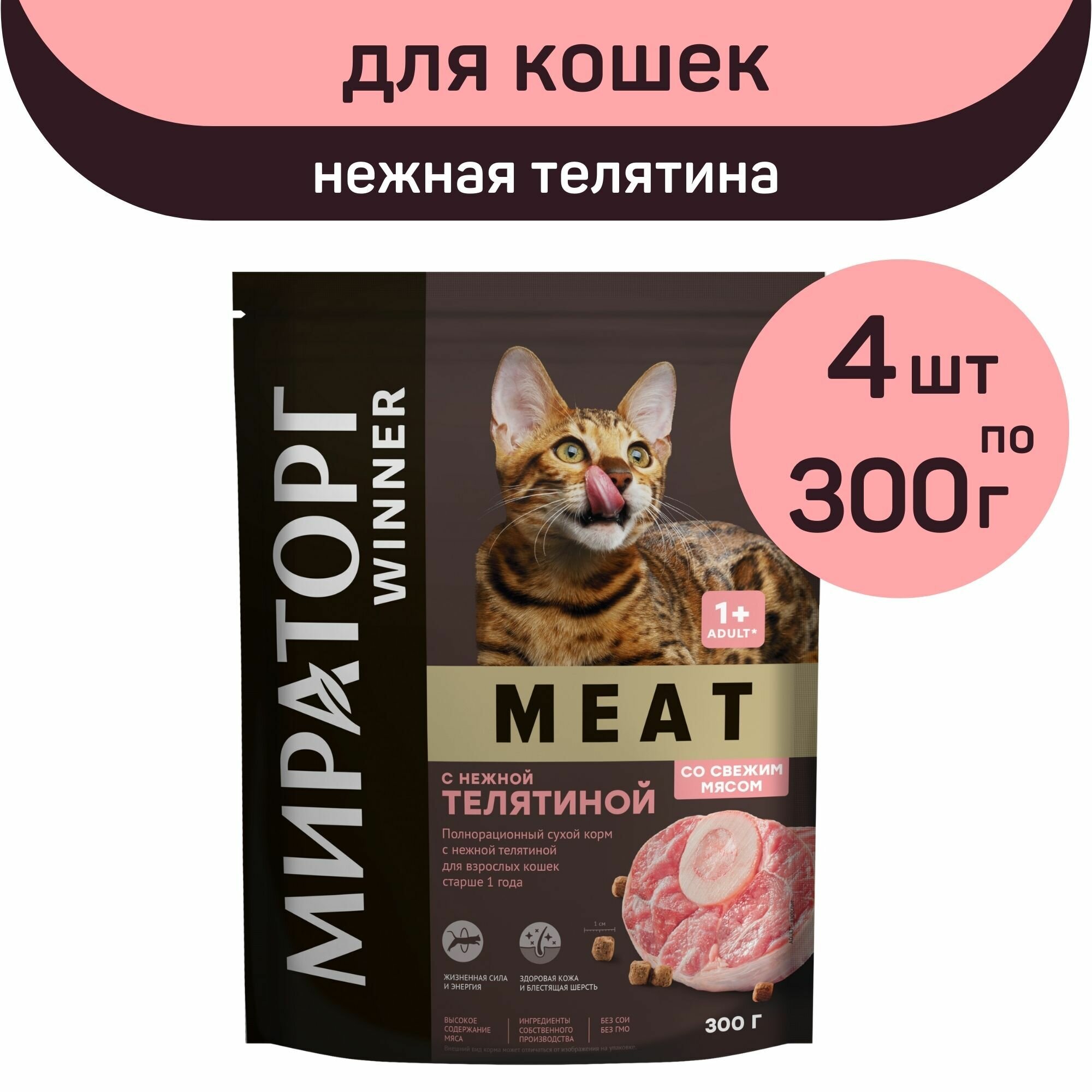 Купить Полнорационный сухой корм Мираторг MEAT с нежной телятиной для взрослых кошек старше 1 года, 4 шт по 300 г