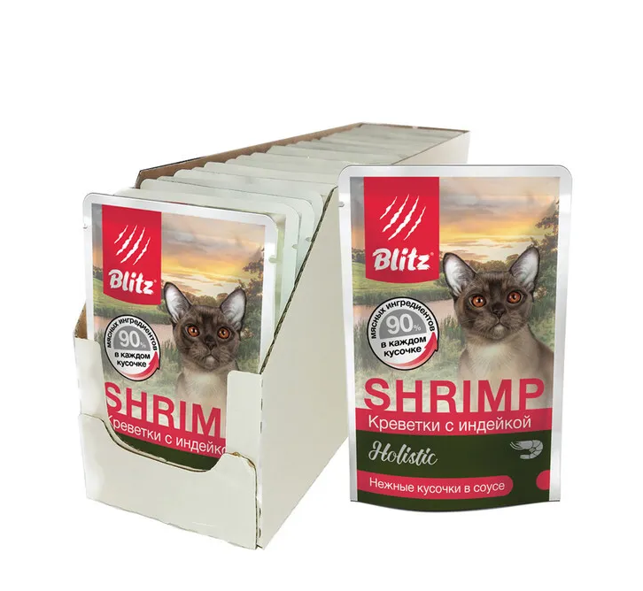 Консервы (паучи) BLITZ HOLISTIC SHRIMP для взрослых кошек с креветками и индейкой в соусе (пауч 85 гр х 24 шт)
