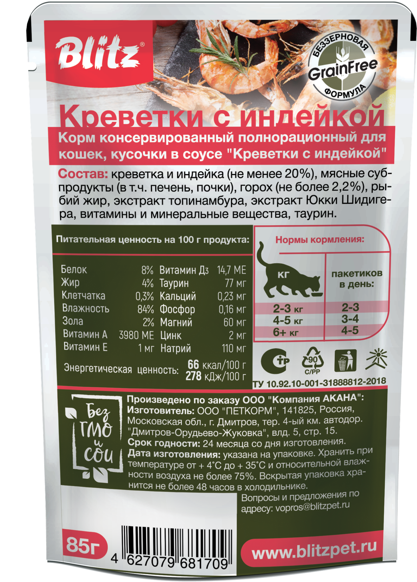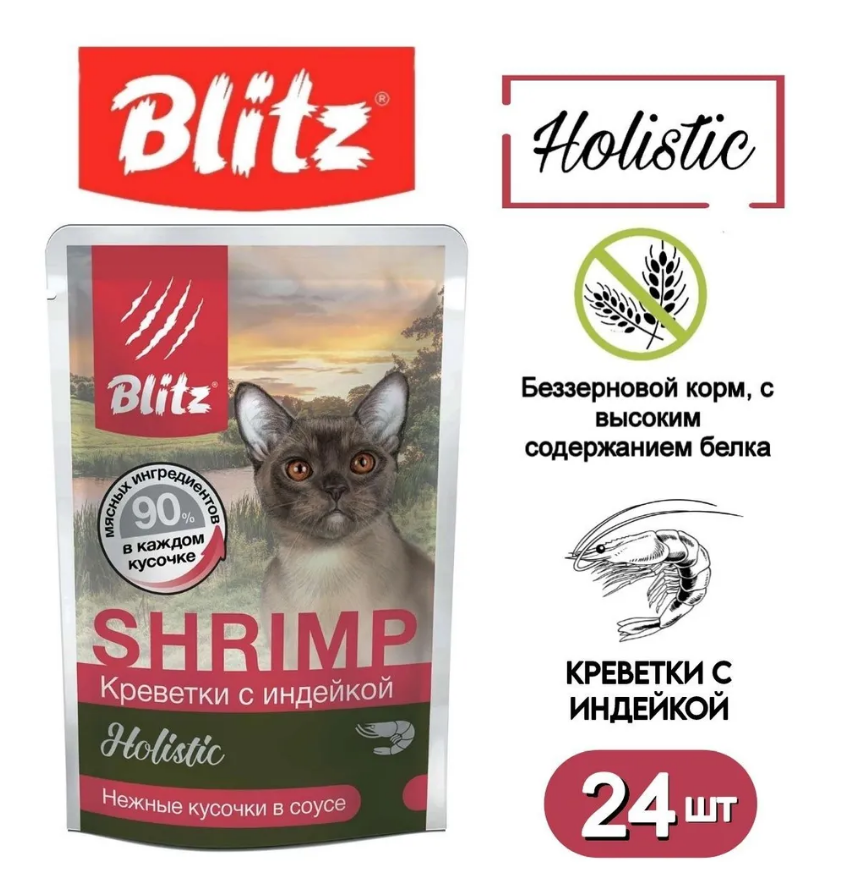 BLITZ HOLISTIC SHRIMP для взрослых кошек с креветками и индейкой в соусе пауч 85 гр 85 гр х 5 шт