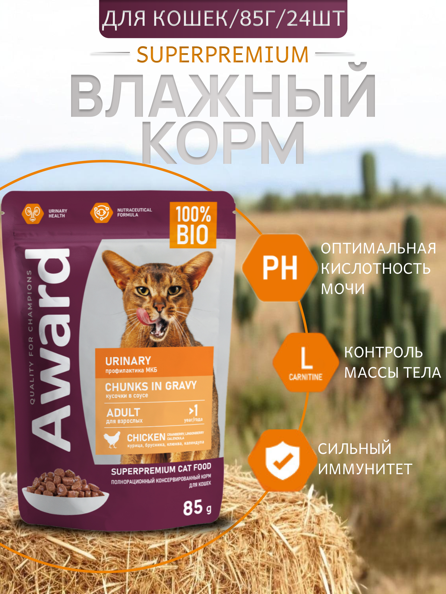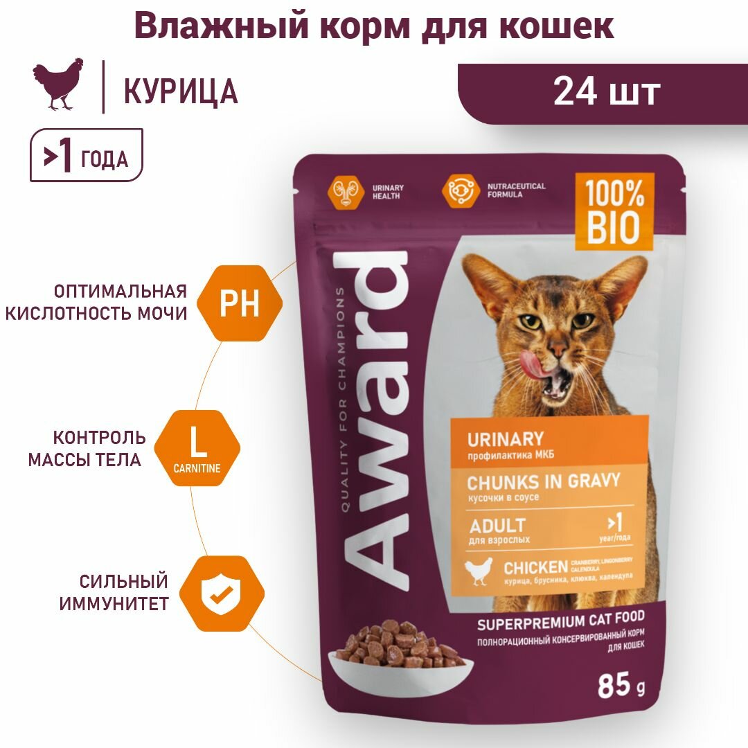 Корм влажный Award Urinary для профилактики мочекаменной болезни у взрослых кошек кусочки в соусе с курицей, 85г х24 шт.