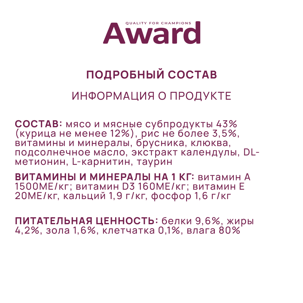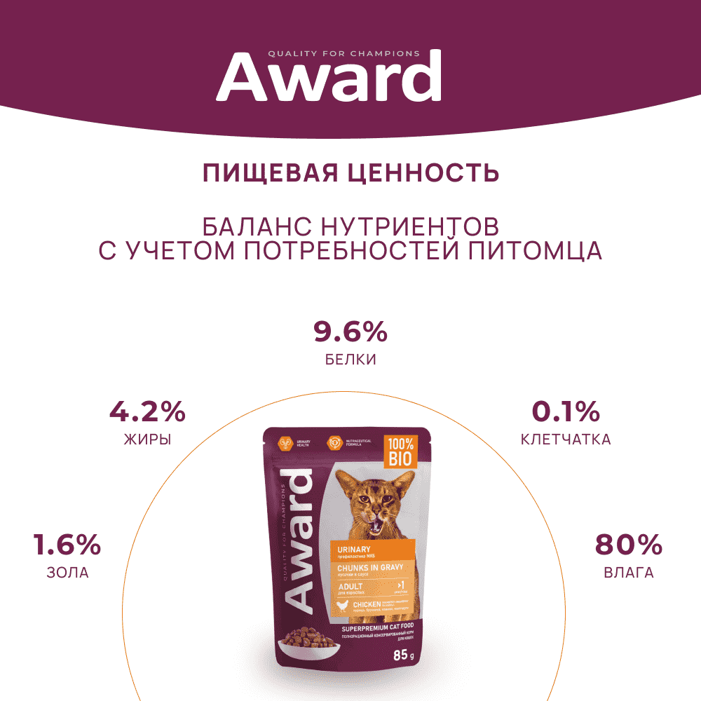 AWARD URINARY CHICKEN для взрослых кошек для профилактики МКБ с курицей соусе пауч 85 гр 85 гр х 12 шт