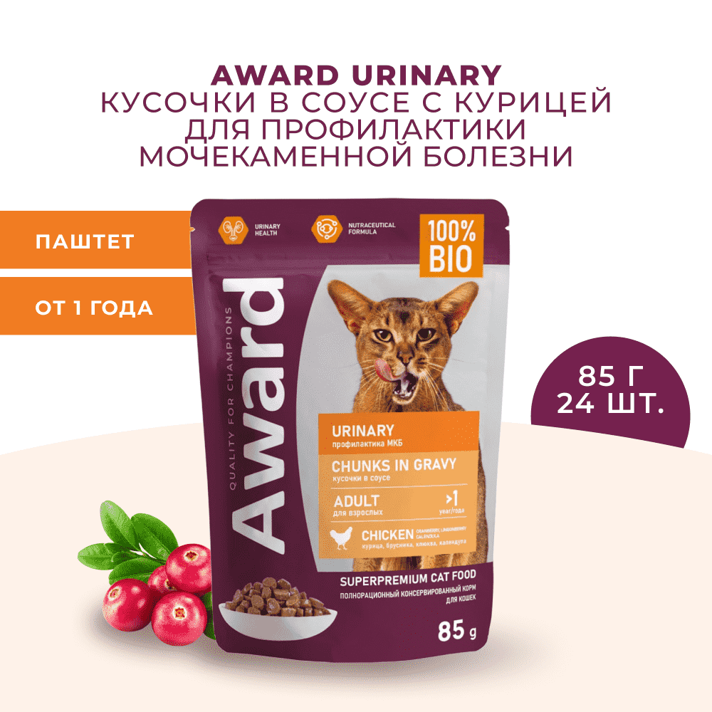 Купить AWARD Urinary влажный корм для взрослых кошек, для профилактики мочекаменной болезни, кусочки в соусе с курицей, в паучах - 85 г х 24 шт