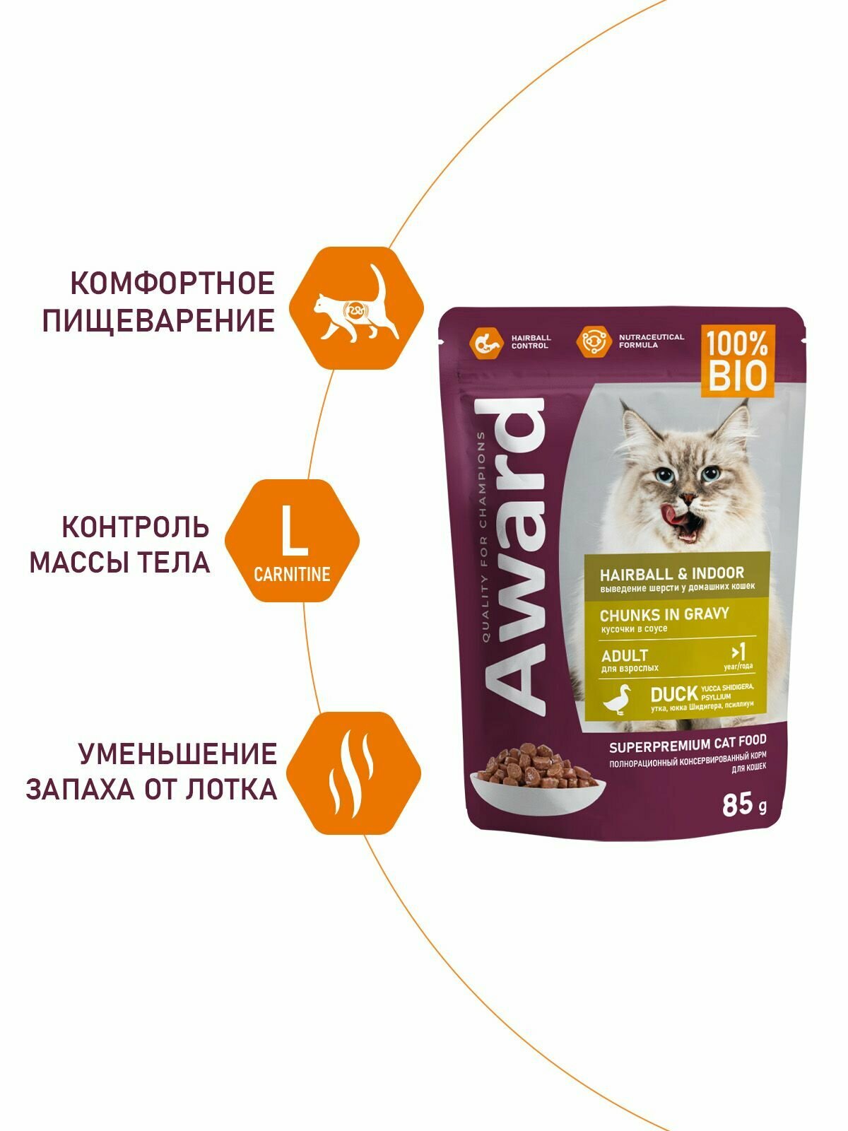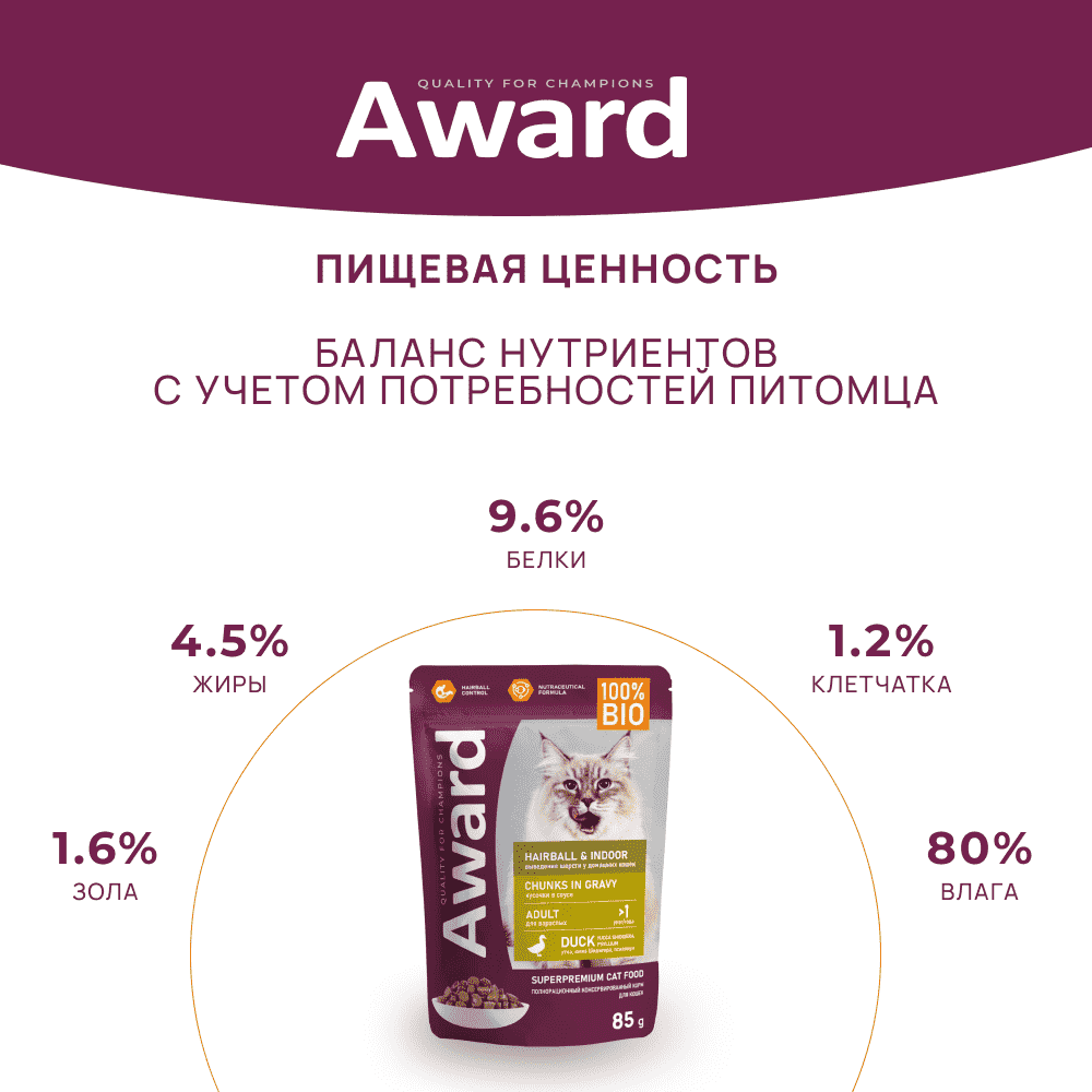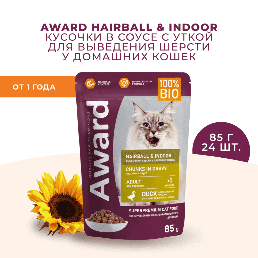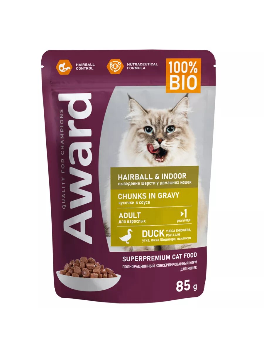 Влажный корм AWARD Hairball & Indoor для выведения шерсти у взрослых домашних кошек кусочки в соусе с уткой 85г × 24 шт.
