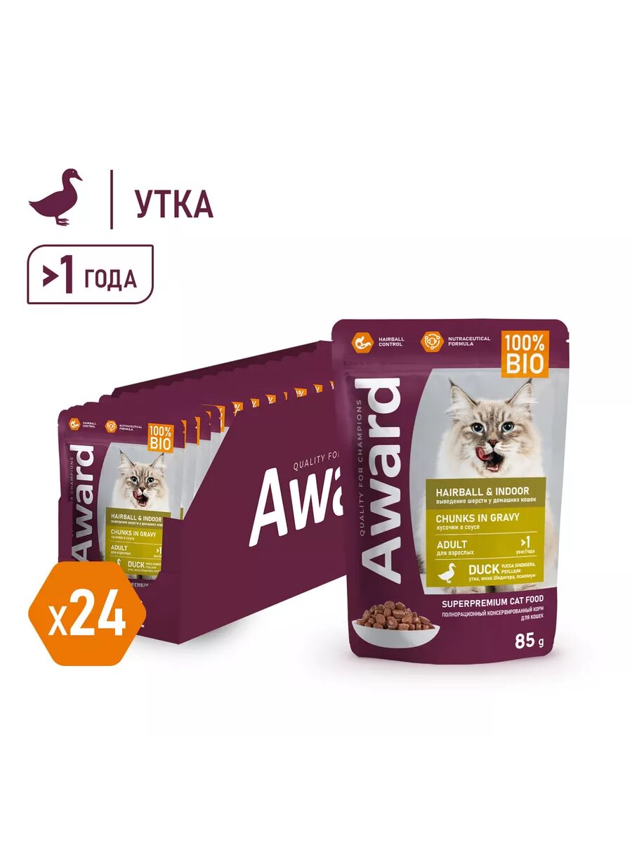 AWARD HAIRBALL & INDOOR DUCK для взр кош живущих дома для вывода шерсти с уткой в соусе пауч 85гр 85 гр х 24 шт