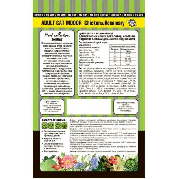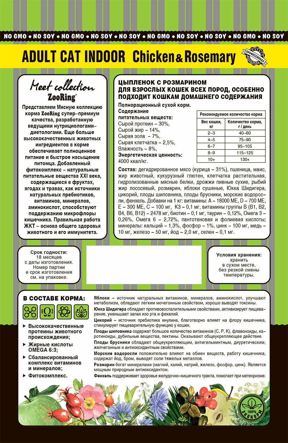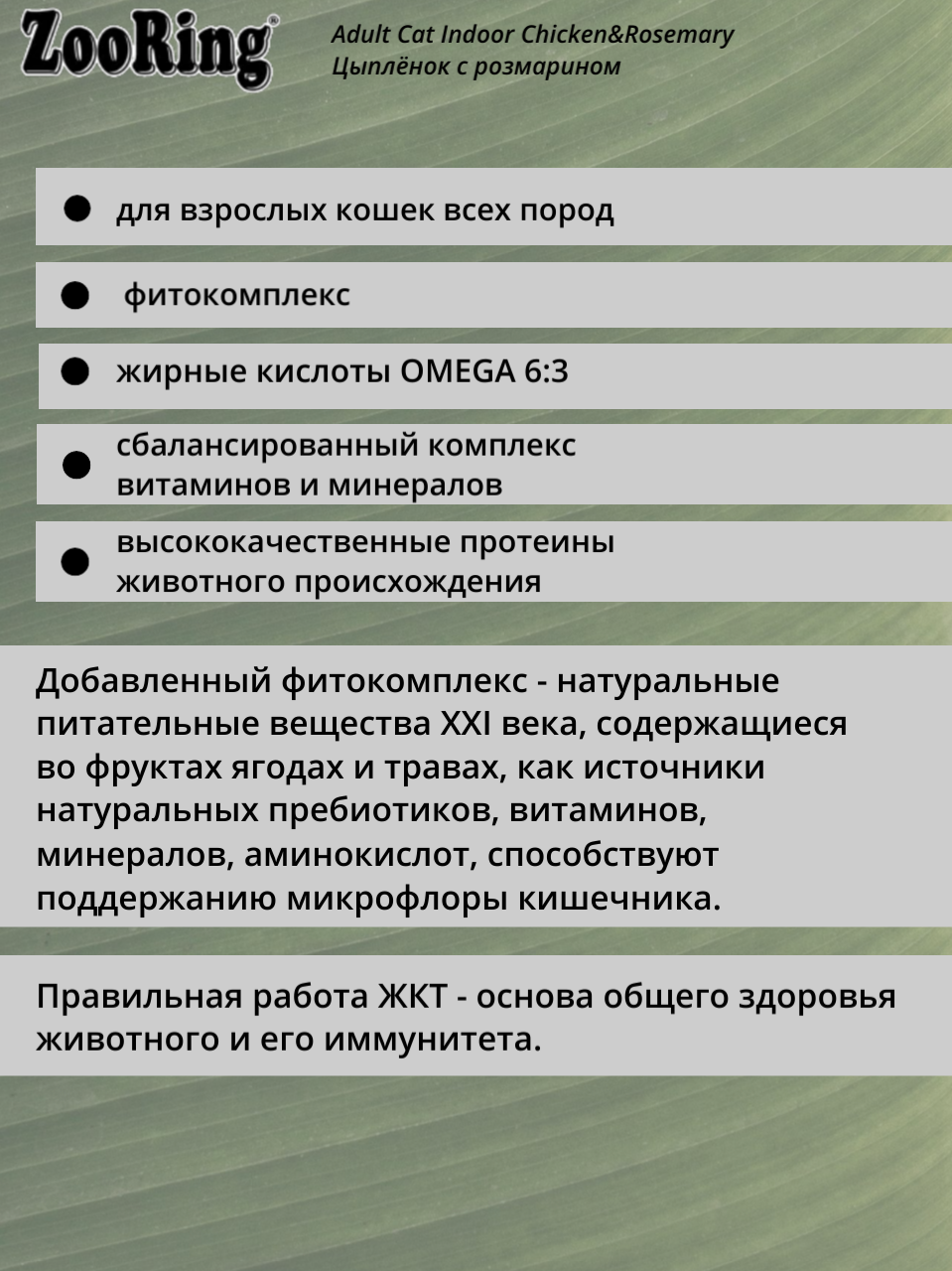 Купить Сухой корм Zooring ADULT CAT INDOOR CHICKEN&rosemary (Цыпленок с розмарином) взрослых кошек всех пород 1упх10 кг