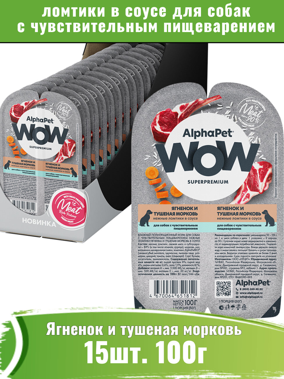 ALPHAPET WOW SUPERPREMIUM 100 гр ламистер влажный корм для собак с чув. пищ ягн. и тушен морк 1х15